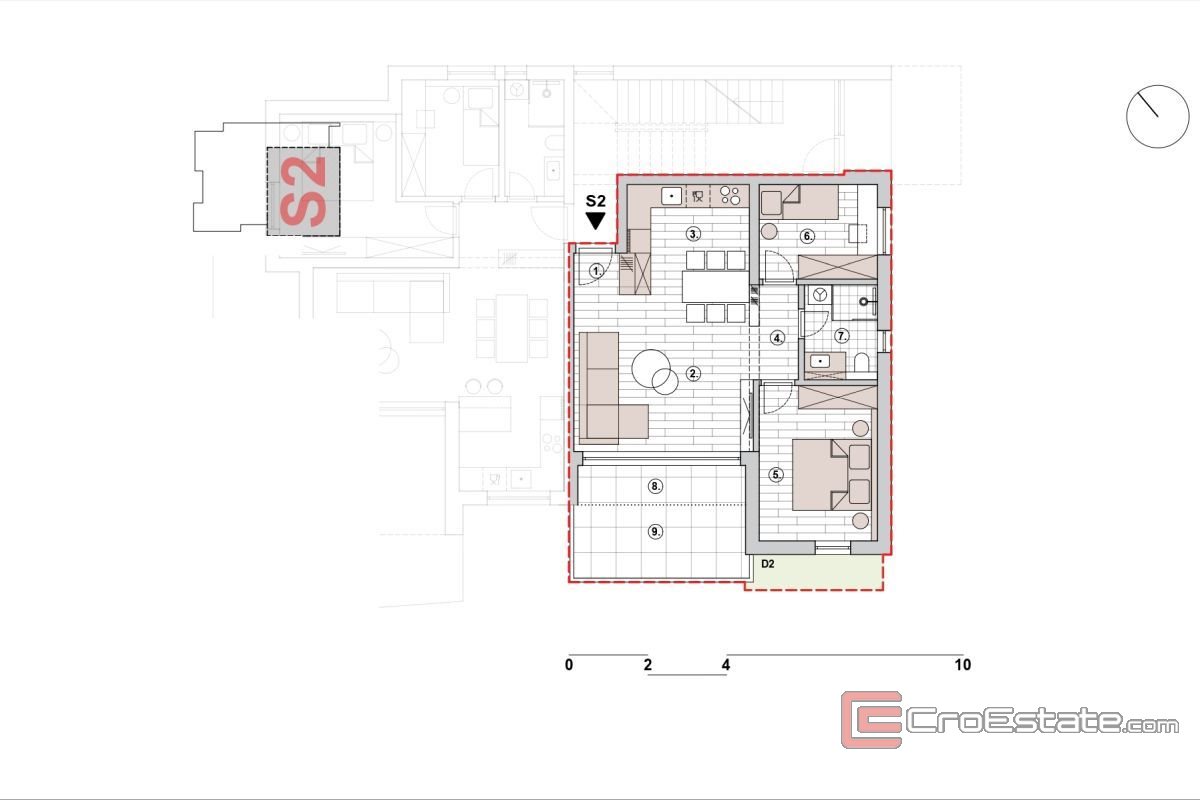 Luxury two-bedroom apartment located in a new building on the ground floor, consisting of seven apartments spread over four floors. The apartment covers 66.94m2 of living space, and has a 3m2 yard, as well as a partially covered terrace of 12.36m2. The terrace has a jacuzzi, as well as a space for enjoyment and relaxation.