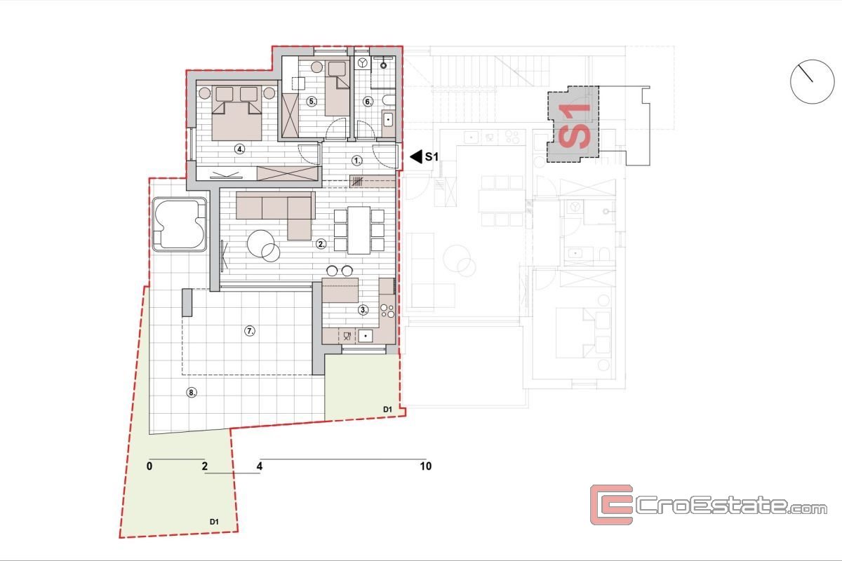 A modern two-bedroom apartment located on the ground floor of a new building consisting of seven apartments spread over four floors. The apartment covers 69.64m2 of living space, and has an attached courtyard covering 18.25m2, as well as a terrace that is partially covered and measuring 38.17m2. The terrace has a jacuzzi, as well as a space for enjoyment and relaxation.