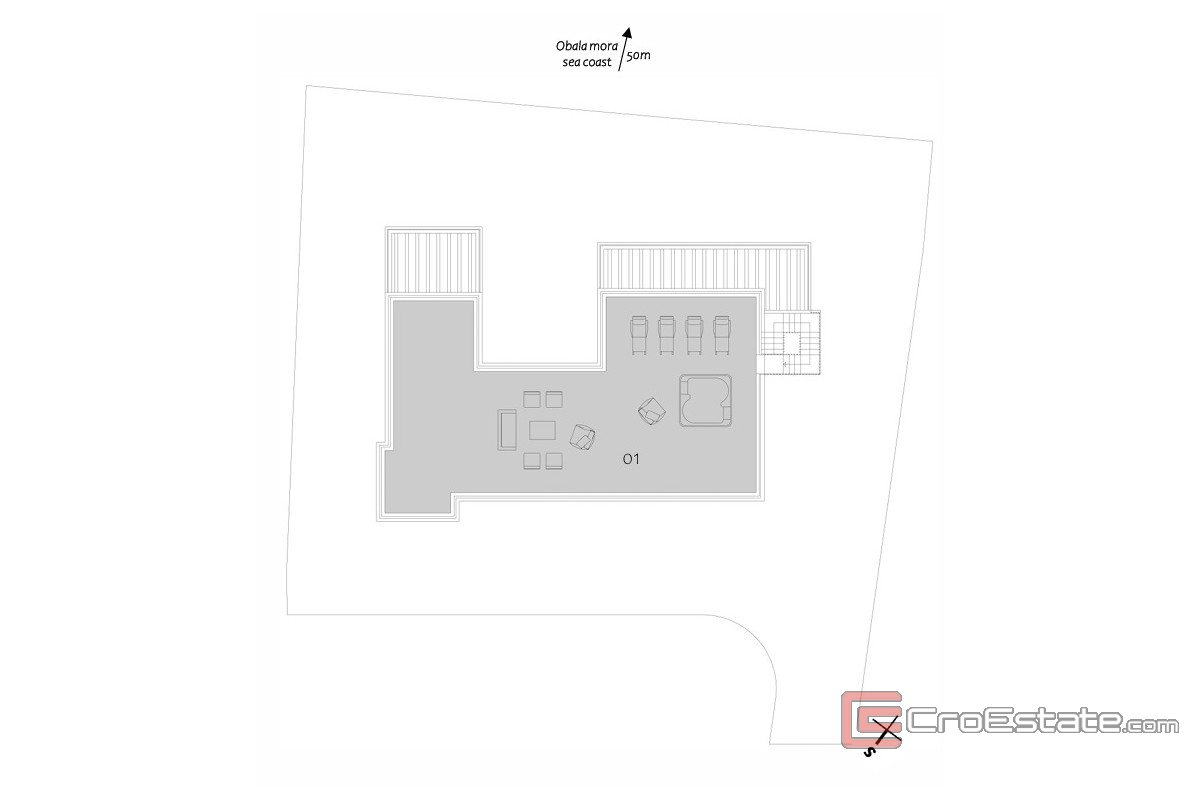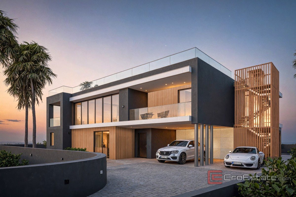 On the upper floor there are three spacious bedrooms, each with its own bathroom. Several covered terraces further emphasize the privacy of the night zone and allow for outdoor living at all times of the day. The highest level is reserved for an impressive 141 m² roof terrace, designed as a private rooftop lounge with an open view of the Adriatic and Pomer Bay. This space provides an exclusive area for sunbathing, relaxation and evening gatherings.