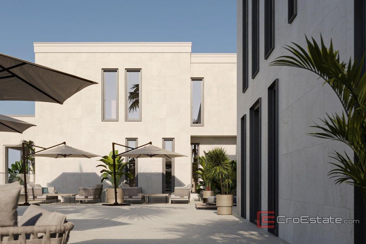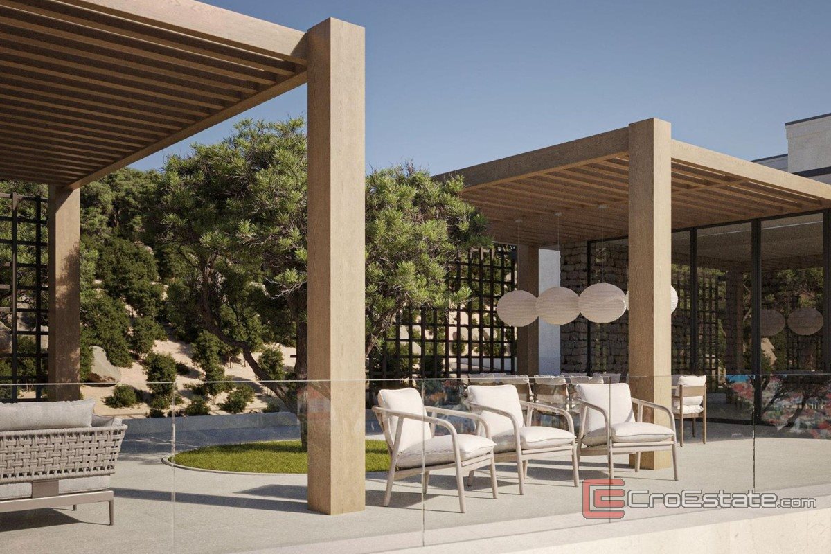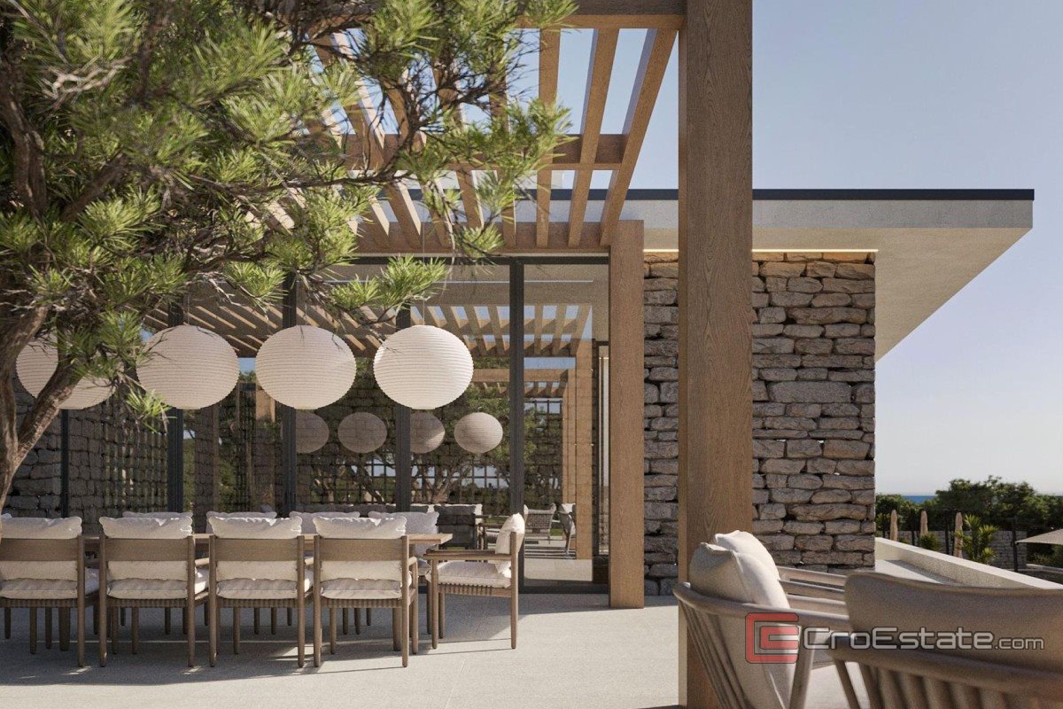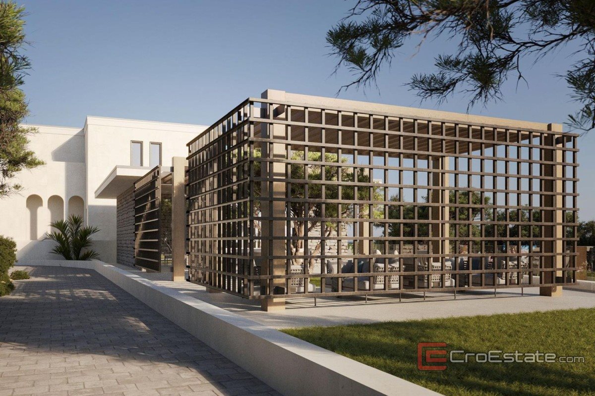 Land for sale with an area of over 12,000 m² with a building permit for the construction of a modern villa with four residential units. The planned gross developed area of the building is slightly less than 1,700 m². The location is in the first row to the sea, with direct access to the sea. The land is south-facing, has a paved access road and secured infrastructure.