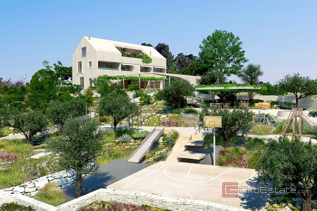 Upstairs there are three bedrooms with en-suite bathrooms, an indoor pool and sauna, while the attic leads to a spacious roof terrace with a memorable view. Outdoor amenities include a pool, sundeck, basketball court, summer kitchen and dining room.
