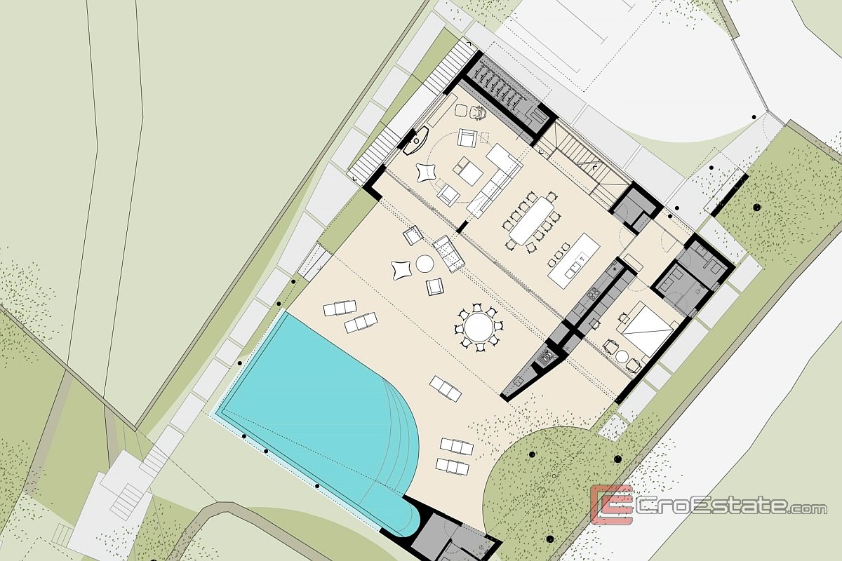 The project includes a luxurious villa with a modern design with an emphasis on functionality and comfort. The basement has space for a wine cellar, lounge, cinema, bathroom and engine room. The ground floor offers a spacious living room with kitchen, additional bedroom (studio), sanitary facilities and storage room.