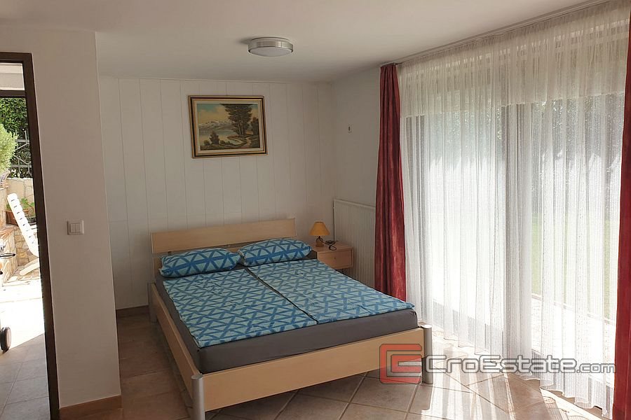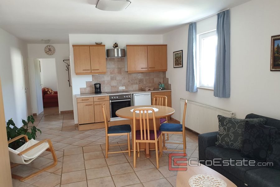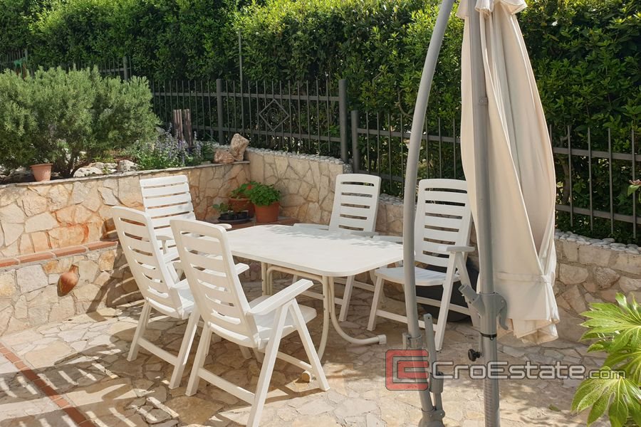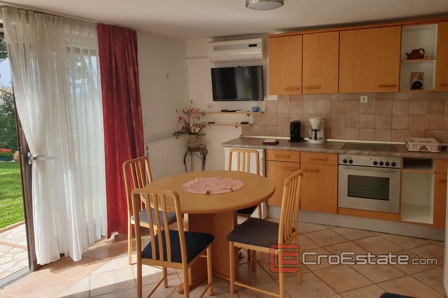 First floor - apartment consisting of a spacious living room connected to the kitchen and dining room, bedroom, two bathrooms and two toilets. The living room opens onto a terrace and a green garden.