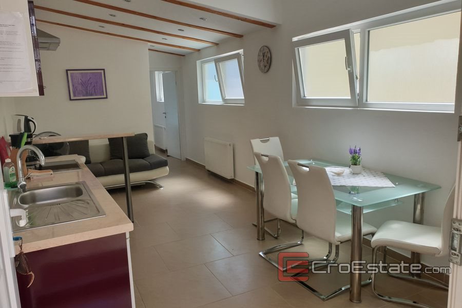 Second floor - two separate residential units. The larger apartment consists of a living room connected to the kitchen and dining room, a bedroom, a bathroom, a toilet and a terrace. A smaller residential unit is a studio apartment consisting of one room that serves as a living room and bedroom, kitchen and dining room, bathroom and terrace.