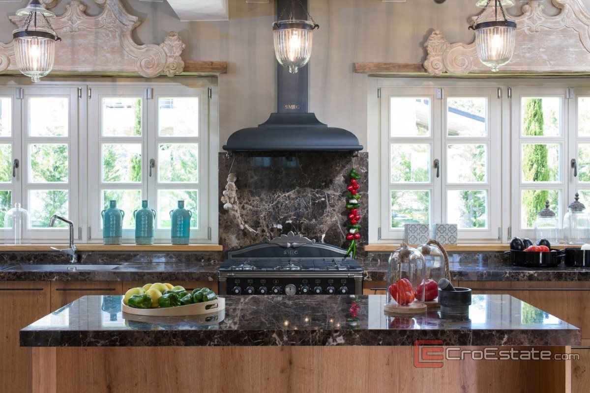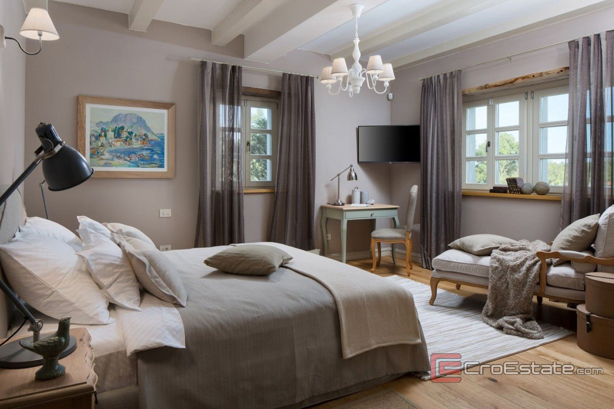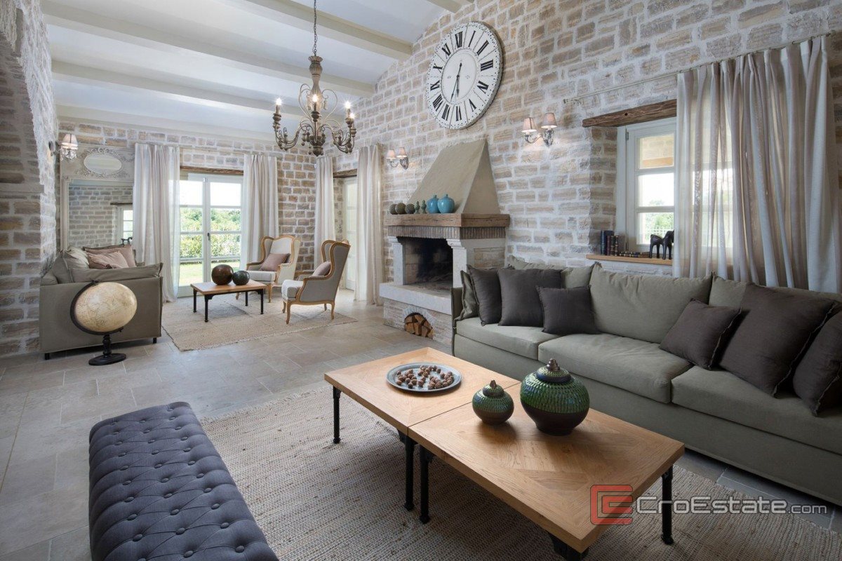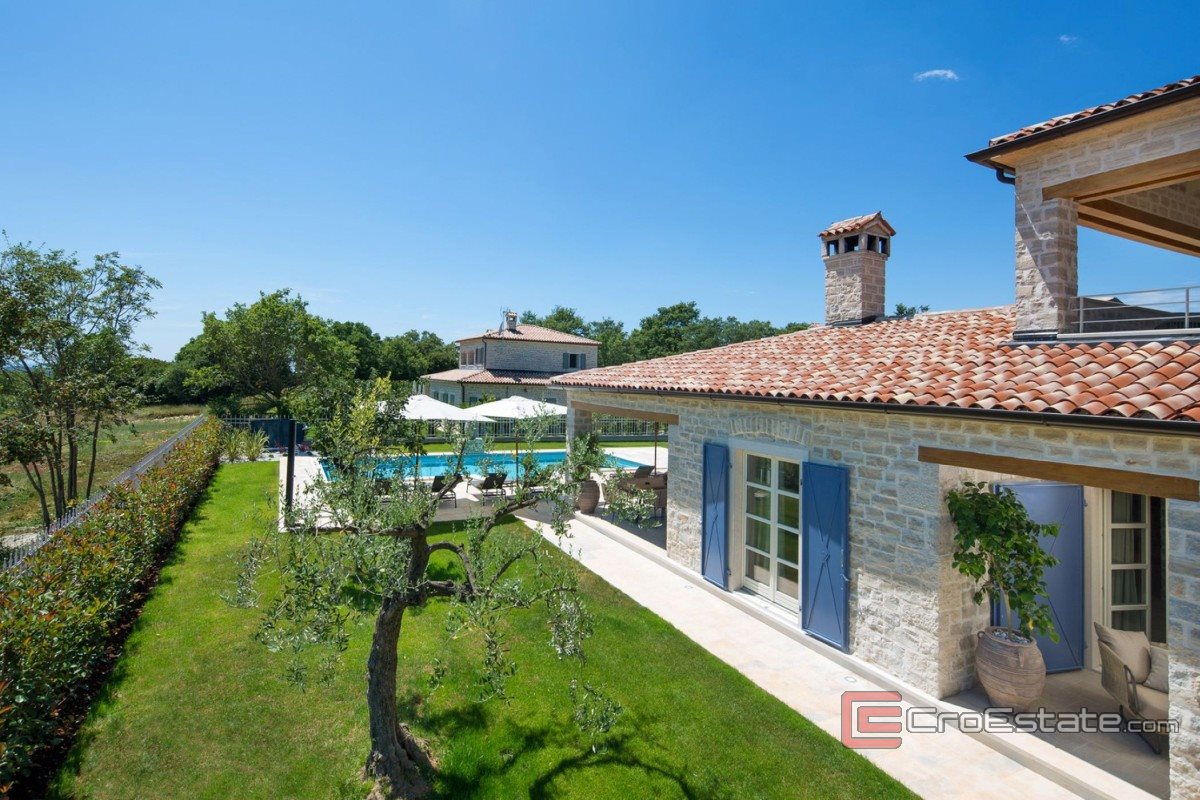 This luxury property in central Istria, measuring 353 m², is situated on a plot of 1,000 m². It is equipped with a gas heating system and air conditioning in all rooms. The ground floor consists of a living room with a fireplace, a dining room, a kitchen and a bedroom with a bathroom. On the first floor there are three bedrooms with bathrooms, two of which have access to a terrace with a view of nature. The landscaped courtyard includes a swimming pool, barbecue, sunbathing area and parking. Each villa in the resort has a 25% co-ownership in a closed sports and recreation complex of 5,600 m². Guests and owners have the opportunity to use football, basketball and tennis courts, all equipped with lighting for use in the evening.