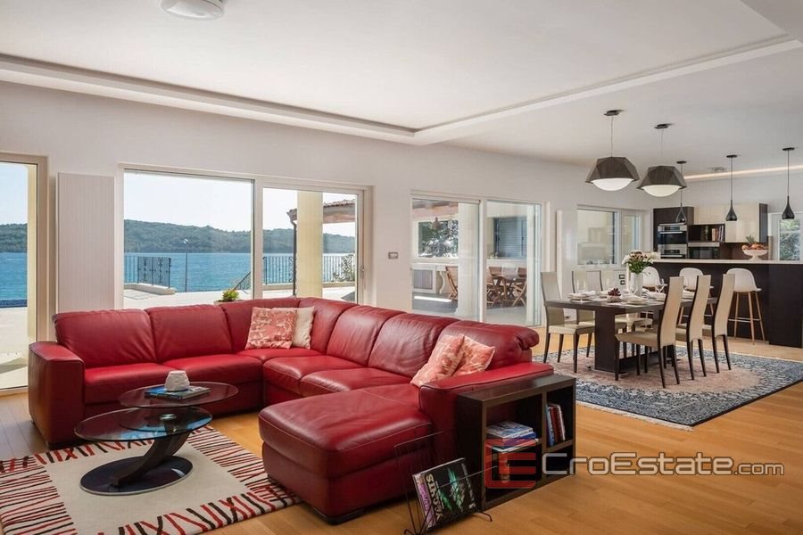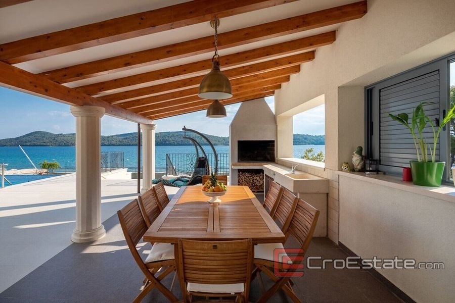 The property has an indoor and outdoor infinity pool, the outdoor part of the garden is enriched with an outdoor kitchen, dining room and sunbathing area with direct access to the beach.