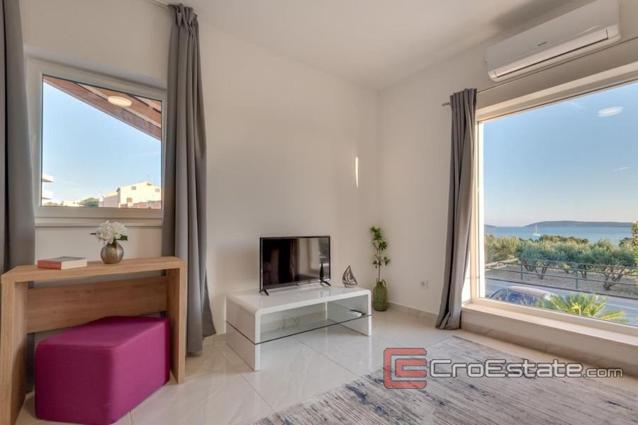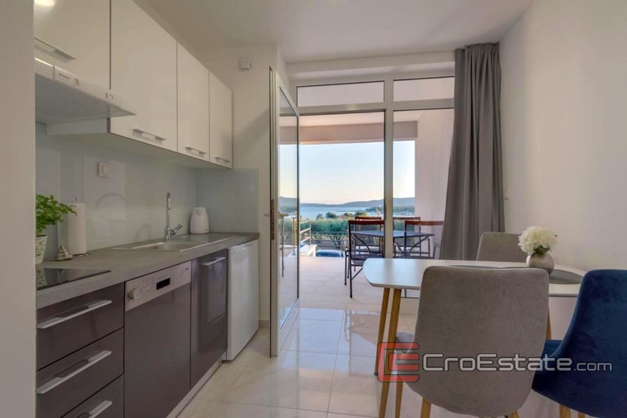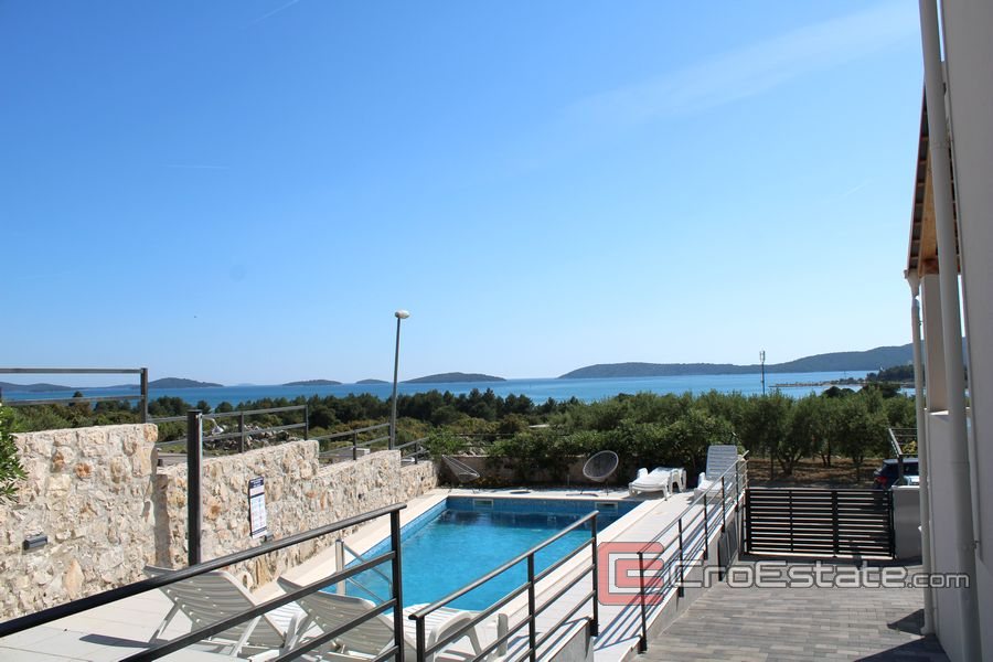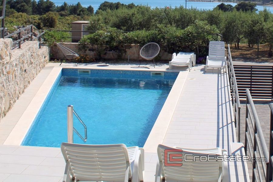 In the yard there is a swimming pool with a beautiful view of the islands and the sea. In front of the yard is parking for eight parking spaces.