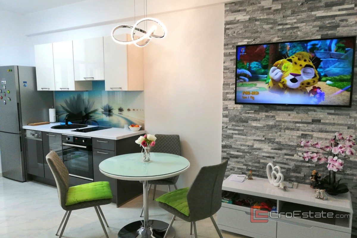On the first floor, which is accessed via a separate entrance from the back of the house, there is a fully furnished and very charming apartment. It consists of a kitchen, dining room and living room in an open concept, a modern bathroom and a bedroom.