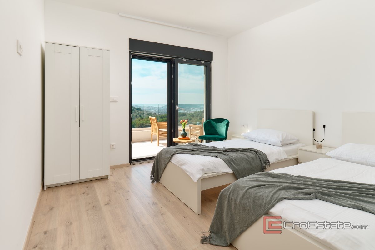 The villa covers approximately 270m2 of living space, while the property is located on a plot of 450m2. The villa has 2 outdoor parking spaces, and covers three floors, a basement, ground floor and first floor. The basement is provided for a technical storage room for the pool and is ideal as a storage room. The ground floor is provided for an entrance hall that leads to an open space where there is a living room, kitchen and dining room, as well as a toilet and storage room. The living room has direct access to a terrace that is partially covered and offers a beautiful view of the city of Split, Klis Fortress, the sea and the surrounding area. On the terrace there is a swimming pool with a sundeck, an outdoor dining area, a fireplace and a green area. Also next to the fireplace, everything is set up for an open summer kitchen. The internal stairs lead to the first floor, where there are four elegantly decorated bedrooms, each with an attached bathroom, facing south and with access to a balcony. On the first floor, there are two balconies, the northern balcony is 9.25m2, while the southern balcony is 31.55m2.