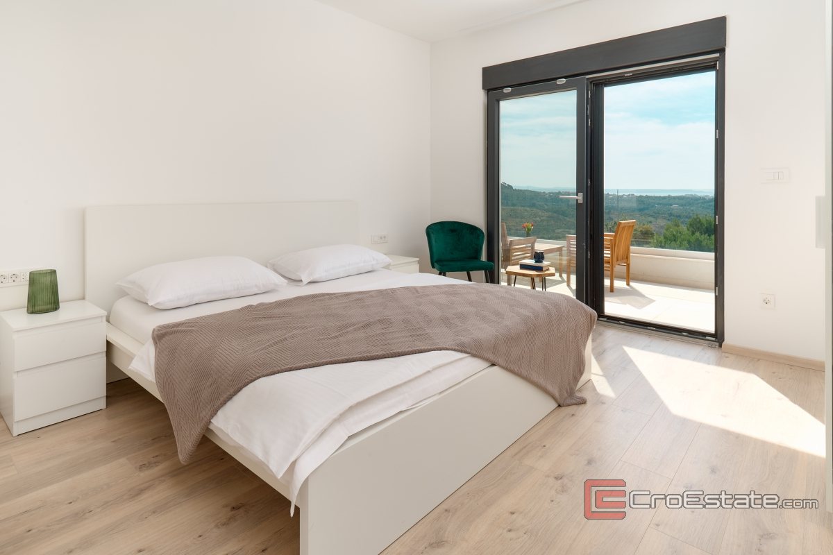 The villa covers approximately 270m2 of living space, while the plot is 450m2. The villa has 2 outdoor parking spaces, and covers three floors, a basement, ground floor and first floor. The basement is provided for a technical storage room for the pool and is ideal as a storage room. The ground floor is provided for an entrance hall that leads to an open space where there is a living room, kitchen and dining room, toilet and storage room. The living room has direct access to a terrace that is partially covered and offers a beautiful view of the city of Split, Klis Fortress, the sea and the surrounding area. On the terrace there is a swimming pool with a sundeck, an outdoor dining area, a fireplace and a green area. Also next to the fireplace, everything is set up for an open summer kitchen. Internal stairs lead to the first floor, where there are four elegantly decorated bedrooms, each with an en suite bathroom, facing south and with access to a balcony. The first floor has two balconies, facing south with an area of 23.65m2, and facing north with an area of 9.25m2.