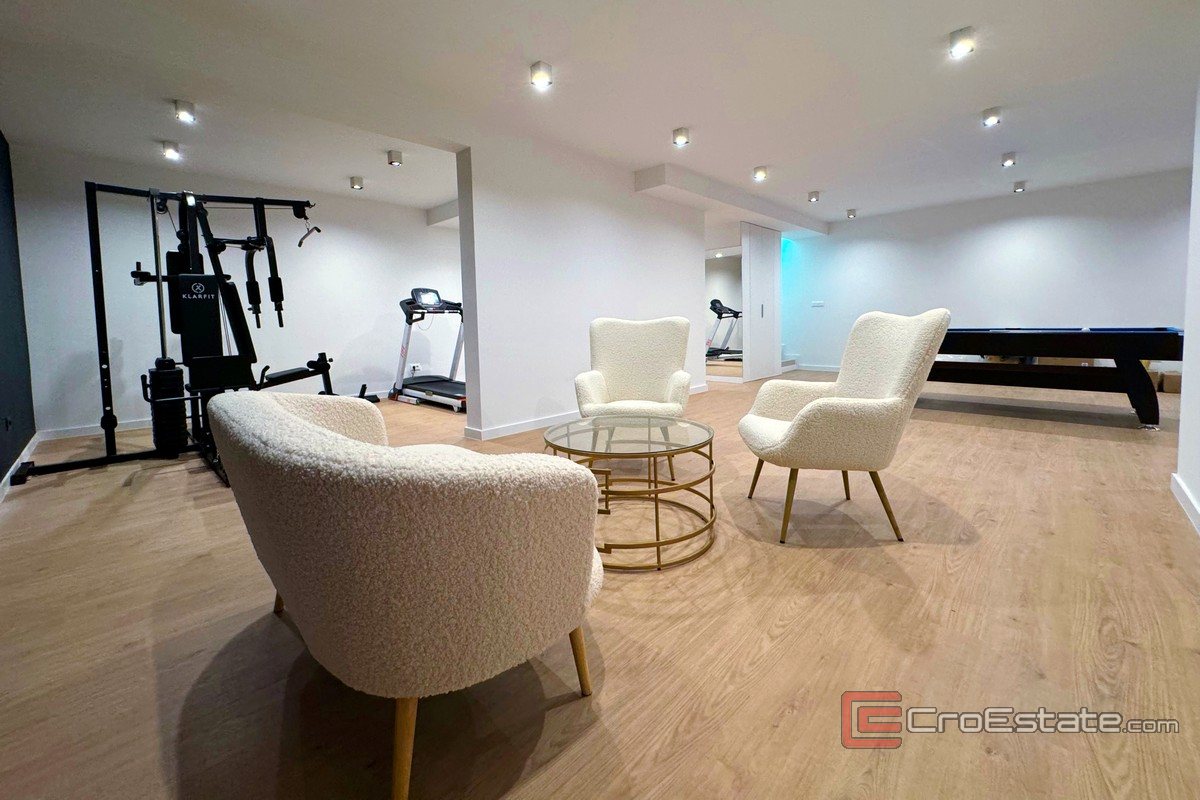 The layout of the rooms is designed for maximum functionality and comfort. In the basement there is a gym, a playroom and a laundry room, perfect for an active and organized lifestyle. The ground floor includes an elegantly decorated kitchen, dining room, spacious living room, sauna and two bedrooms with private bathrooms, which ensures privacy and comfort. On the first floor there are four bedrooms, each with its own bathroom, and a study, ideal for work or hobbies.