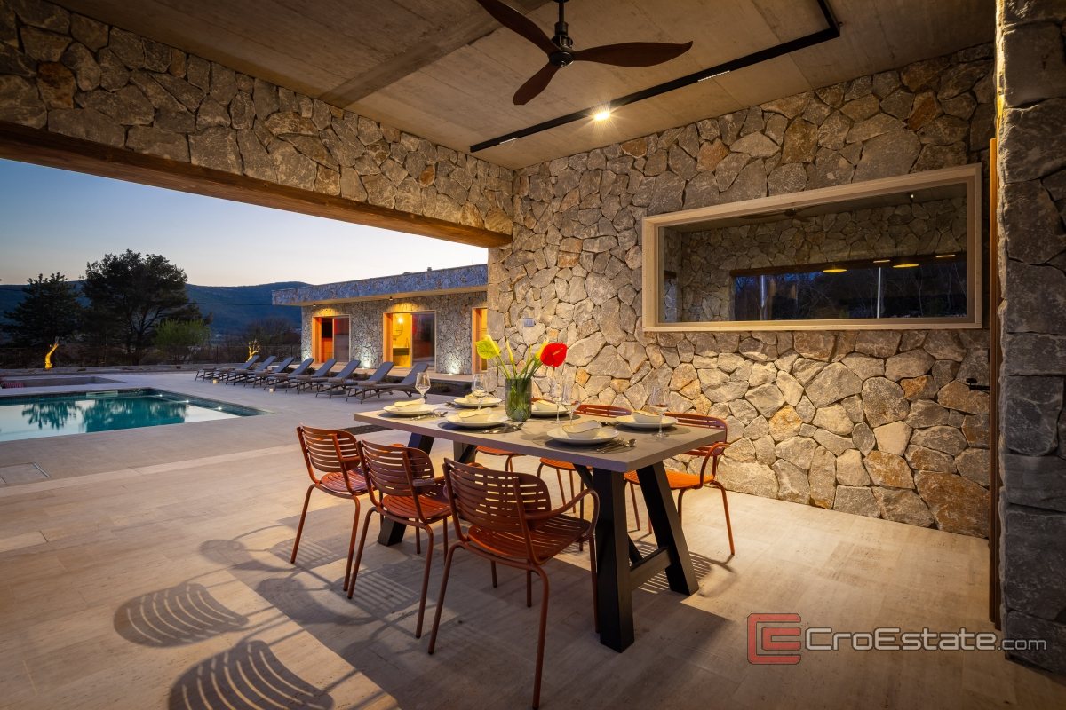 The living area of the villa is 240 m², while the total area of the plot is 2936 m². The facade of the villa is made of beautiful shiny granite stone and concrete, and the interior is made entirely of stone and wood.