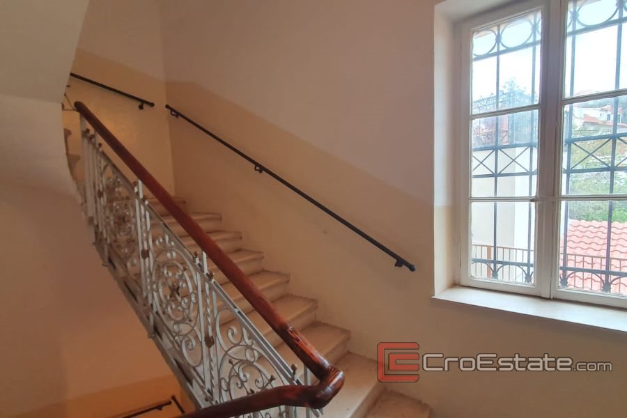 The apartment consists of an entrance hall, kitchen/dining room, living room, three bedrooms and a bathroom. The apartment is sold furnished, but renovation is needed. It has a beautiful view of the waterfront and the city center on one side, and on the other side a view of the Marjan forest park.