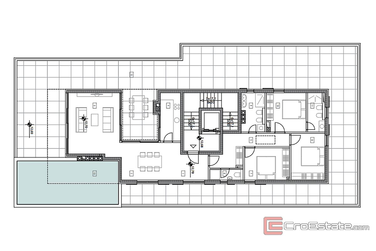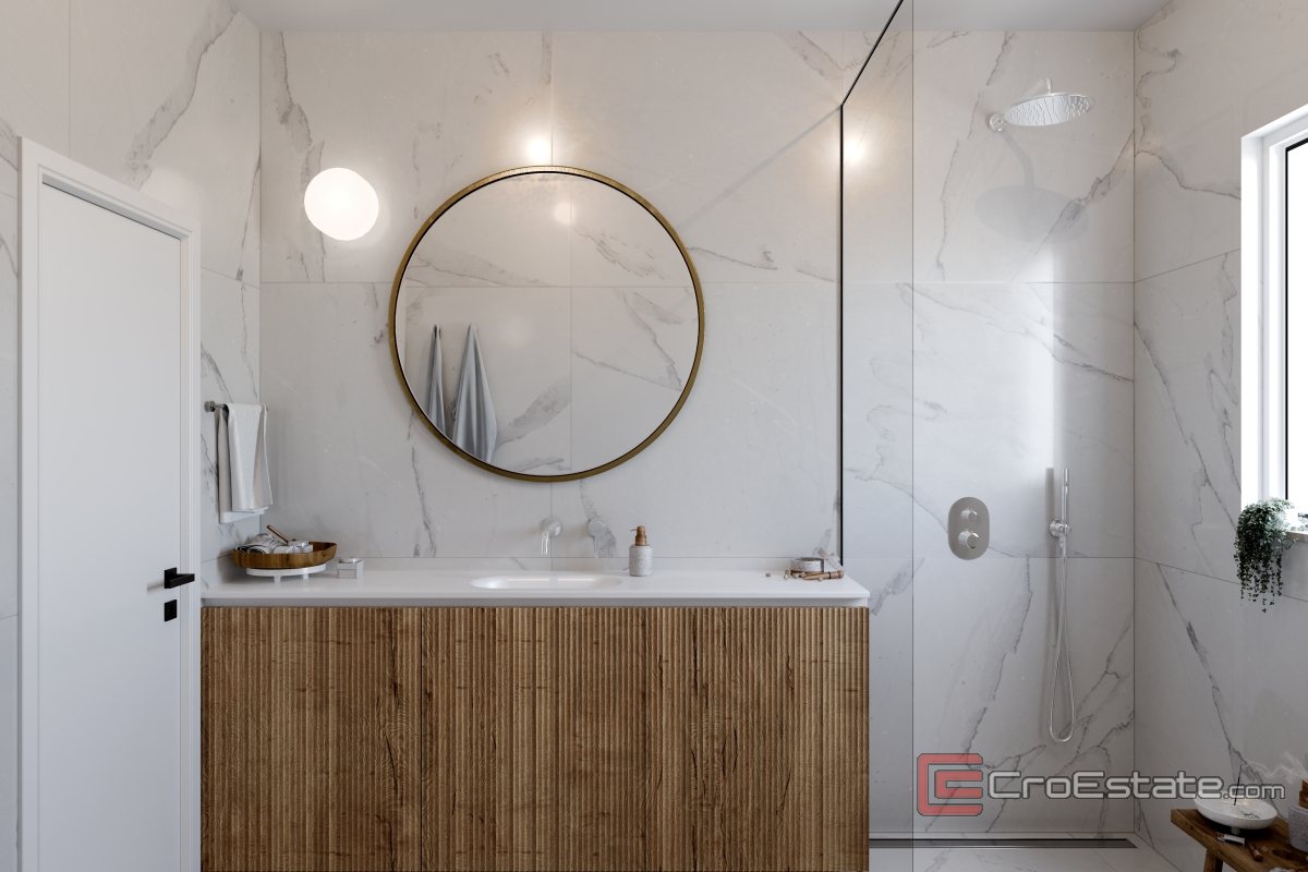 The apartment has a total of 106.73 m² of interior living space and another 208.53 m² of outdoor space consisting of a terrace with a sundeck and a swimming pool. The apartment has an entrance, hallway, three bedrooms, two bathrooms, a toilet and a kitchen, dining room and living room and is characterized by sunshine and open views on all sides. High-quality materials are used in the construction (first-class tiles, parquet floors and sanitary ware, aluminum shutters, electric car chargers, etc.), and heating and cooling are carried out via a heat pump, i.e. underfloor heating and air conditioning. In the basement of the building there is a storage room and garage spaces.