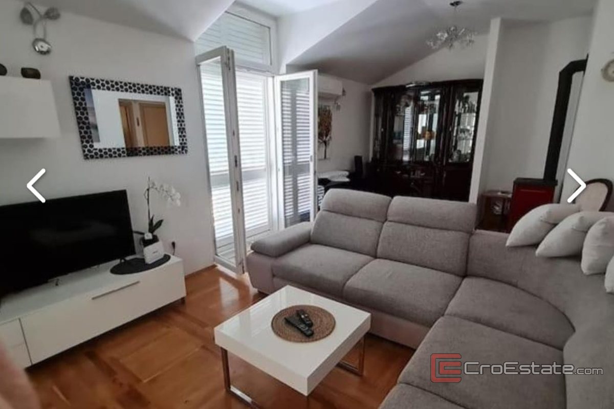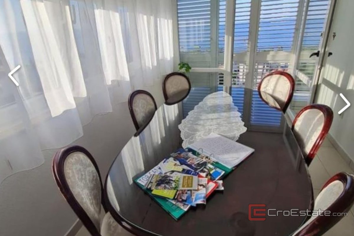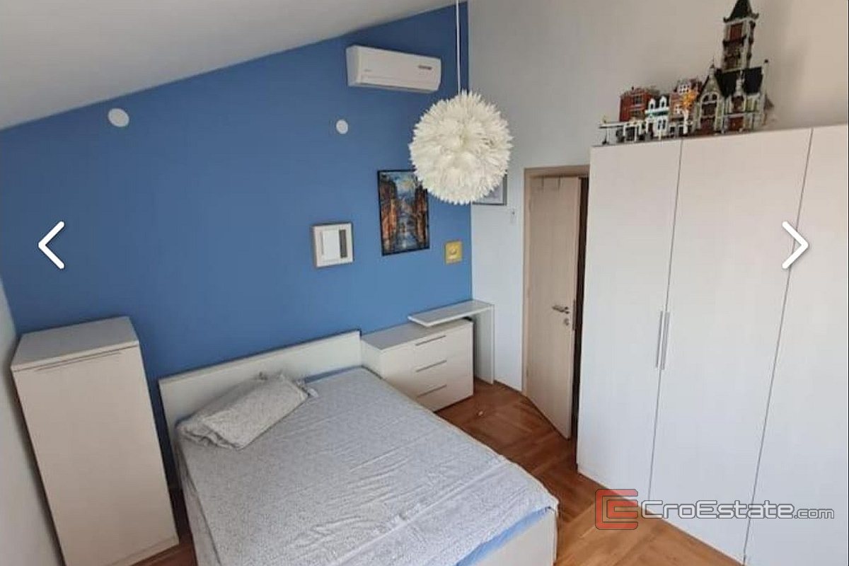 It has 110 m² and consists of an entrance hall, three bedrooms, bathroom and toilet, utility room, kitchen and dining room and living room and a balcony with a sea view. The apartment is rented furnished and equipped. Heating and cooling in the apartment is provided by two air conditioners. Next to the building there is an outdoor parking space that belongs to the apartment, and the biggest advantage of the apartment is the sea view.