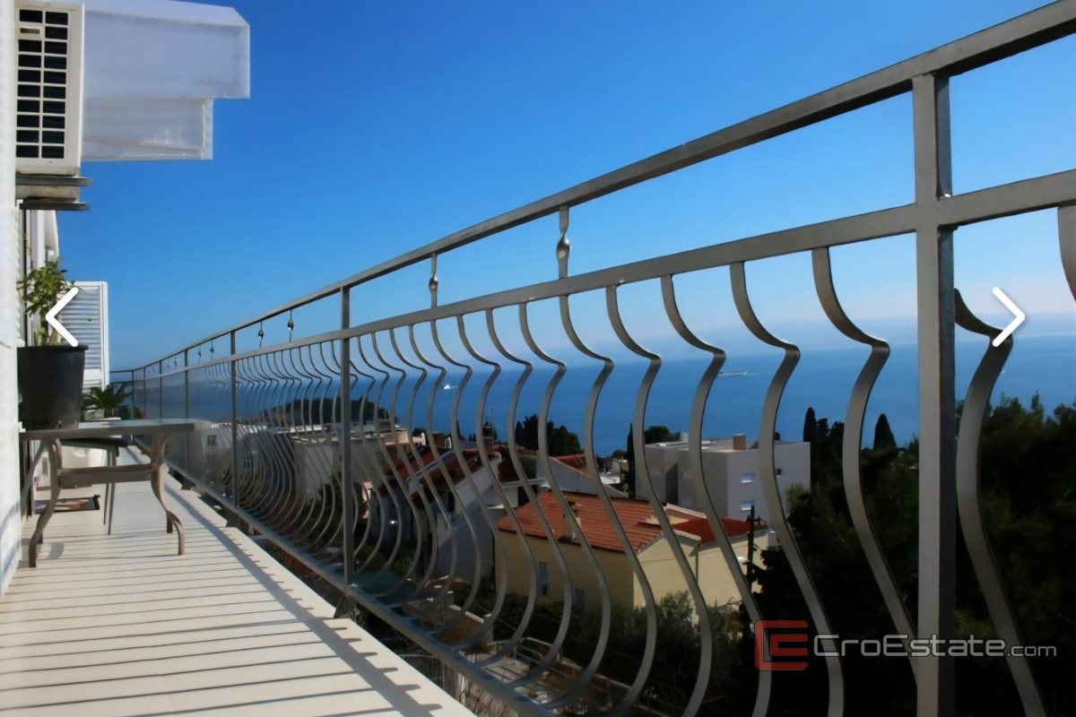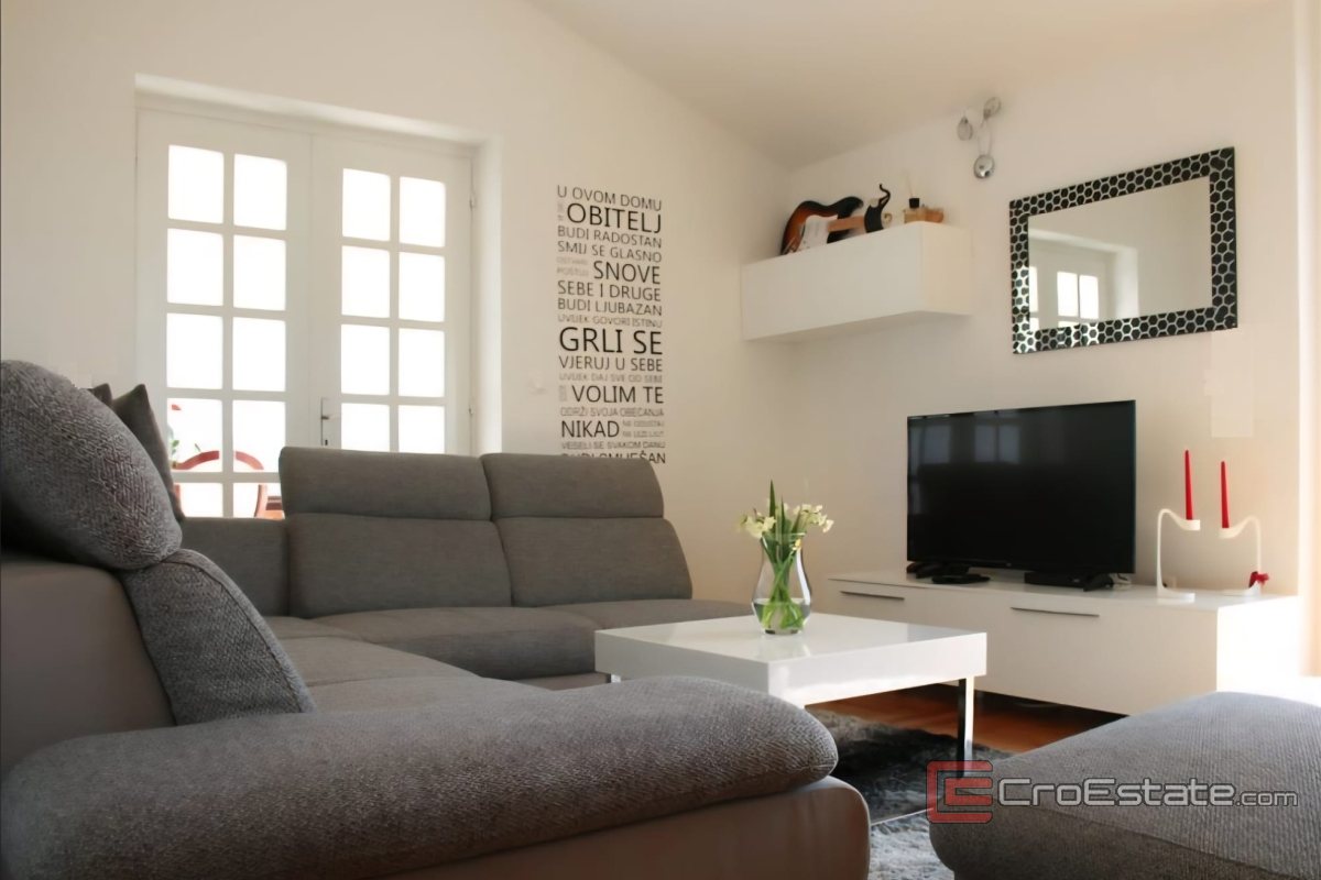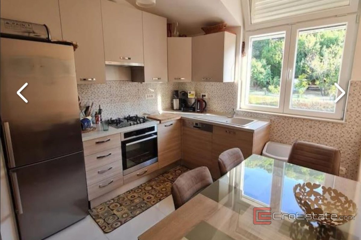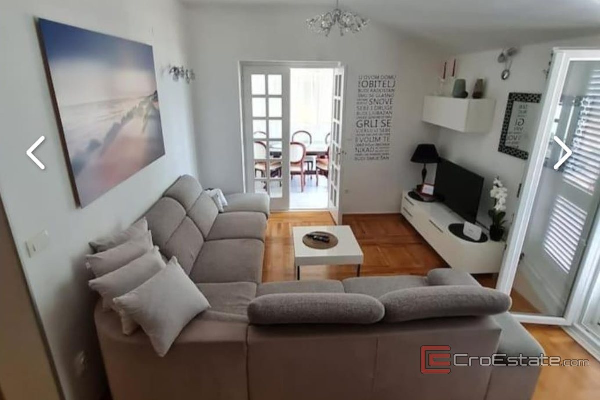 It has 110 m² and consists of an entrance hall, three bedrooms, bathroom and toilet, utility room, kitchen and dining room and living room and a balcony with a sea view. The apartment is rented furnished and equipped. Heating and cooling in the apartment is provided by two air conditioners. Next to the building there is an outdoor parking space that belongs to the apartment, and the biggest advantage of the apartment is the sea view.