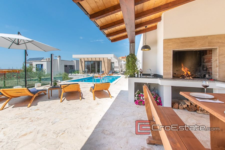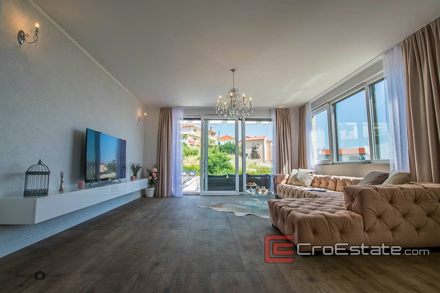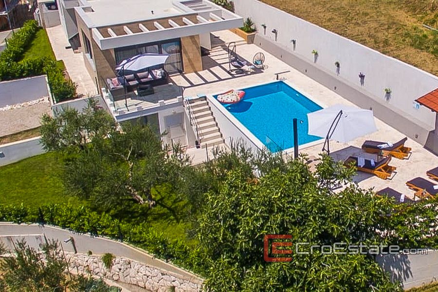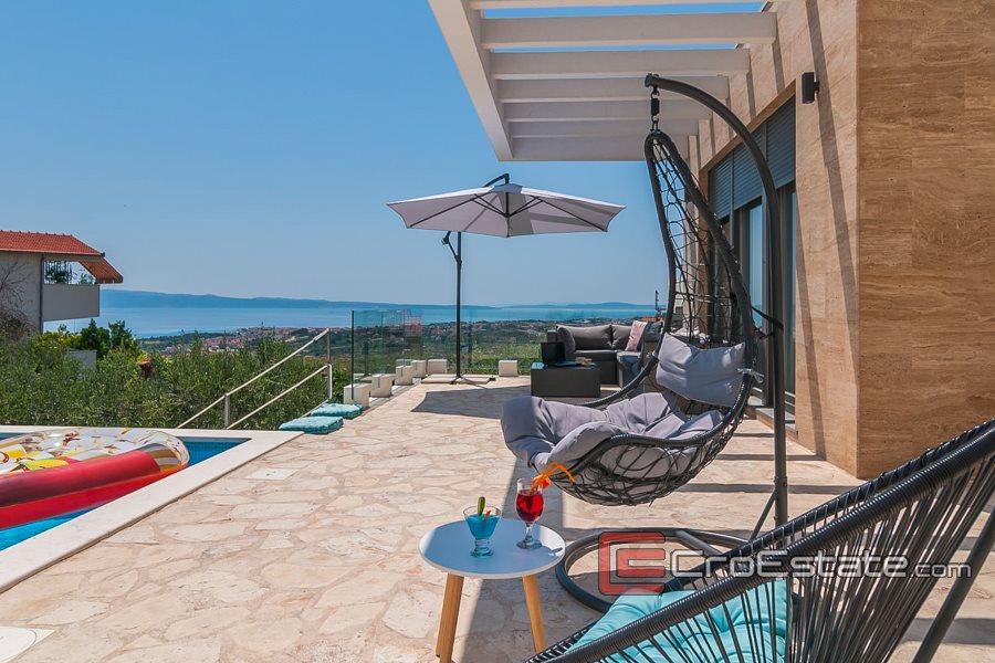 Ground floor house of 138m2 of living space built in 2018 in a quiet location near Split, located on a plot of 860 m2. It has three bedrooms, two bathrooms, laundry room, living room with kitchen and dining area and access to a large terrace with beautiful view of the sea and Split. On the terrace there is a pool of 36m2 and a sun deck, children's playground and a covered summer kitchen with barbecue. Behind the outer part for dining there is a landscaped yard of 160m2 which serves as a garden with Mediterranean horticulture, while below the pool is a small auxiliary house which is currently used as storage for pool equipment, etc.