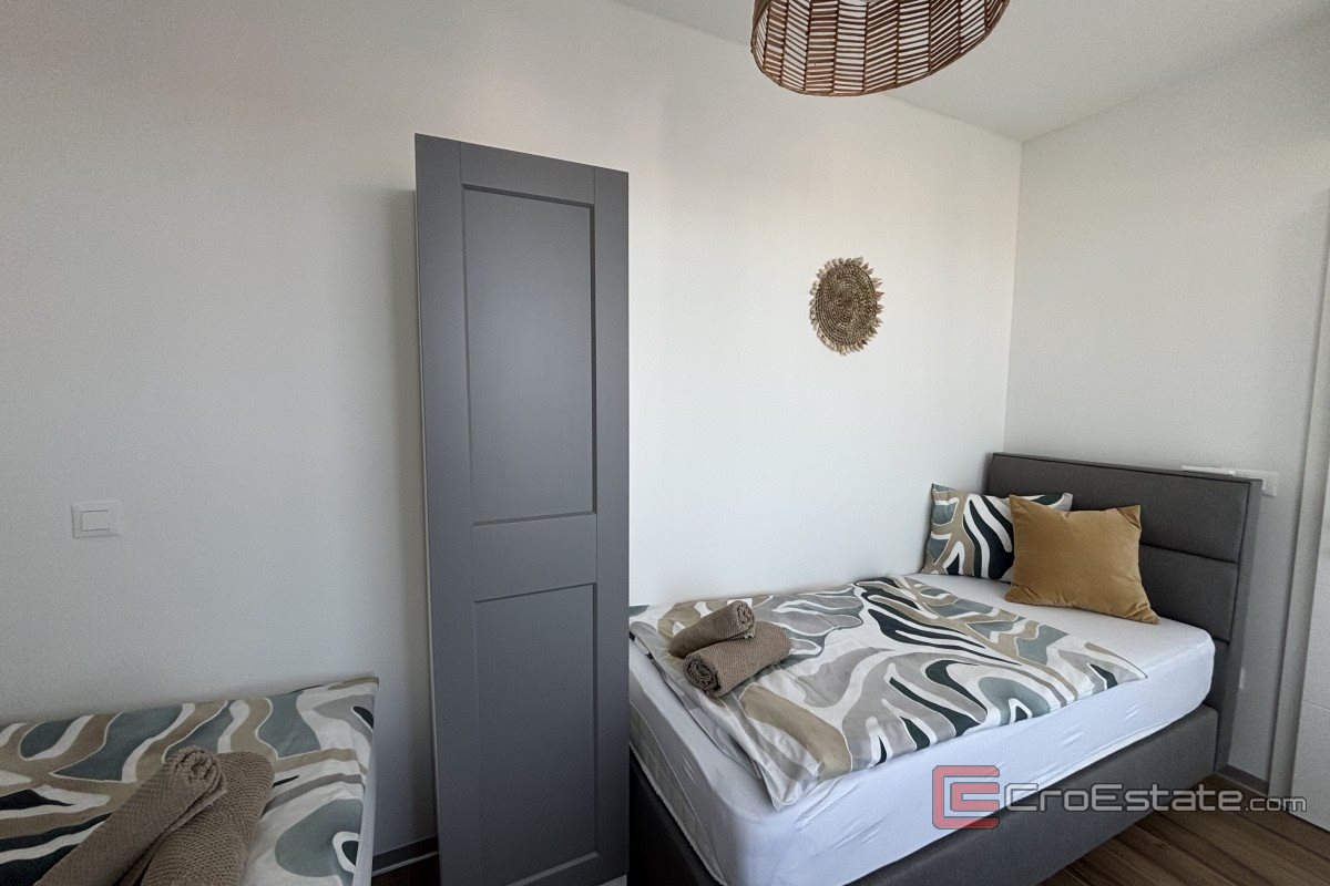 It has 48.44 m² of living space and consists of a kitchen, dining room and living room with access to a 16.04 m² balcony with a sea view, and two bedrooms, one of which has access to a balcony, a bathroom and a hallway. The apartment shares the exclusive right to use the roof terrace with another apartment. The terrace has a usable area of approximately 106 m² with a beautiful panoramic view of the sea and islands. High-quality materials were used in the construction, and heating and cooling is provided by air conditioning in each room and underfloor heating in the bathroom. The apartment is being sold furnished and is equipped with security doors, mosquito nets, electric roller shutters, etc. The penthouse also includes a garage parking space in the basement of the building.