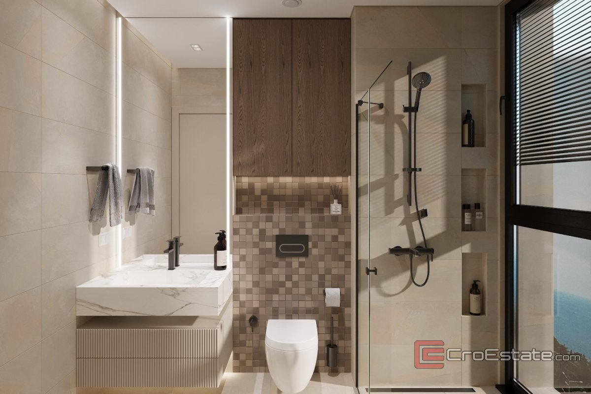 The apartment has a total area of 75 m², southeast orientation, and is abundant in natural light during the day. It has a functional layout and consists of a hallway, laundry room, separate toilet, bathroom, two bedrooms and an open space kitchen, dining room and living room. The living area opens onto a spacious 15 m² loggia with a beautiful view of the sea.