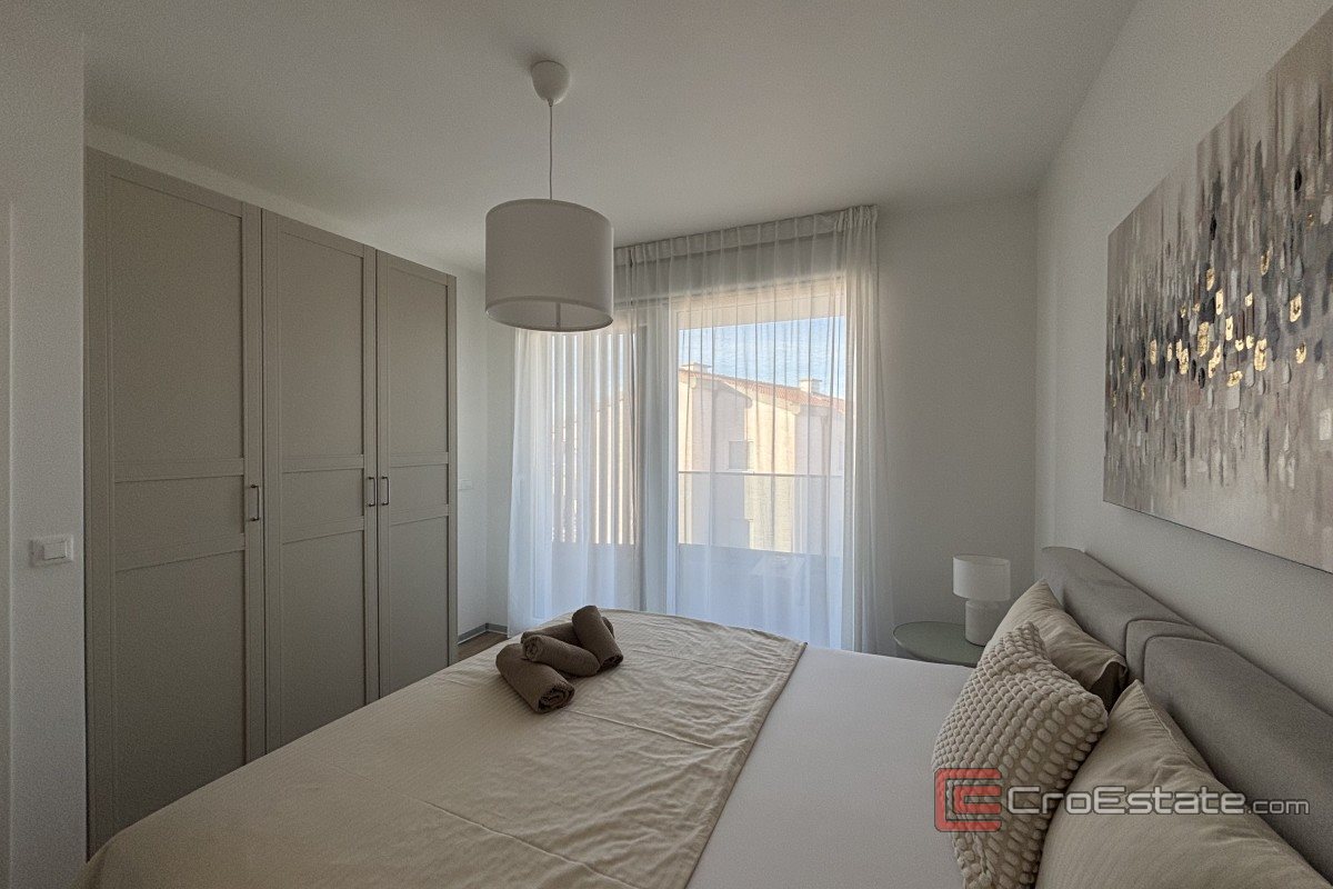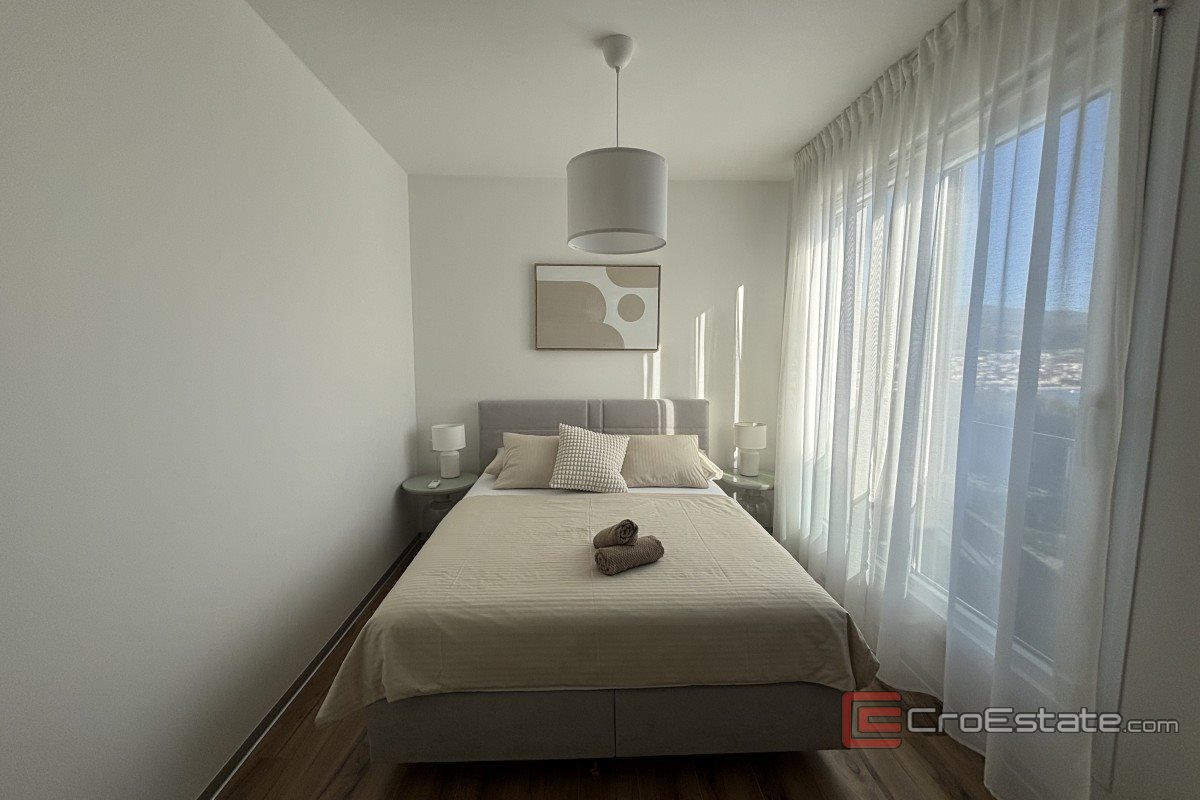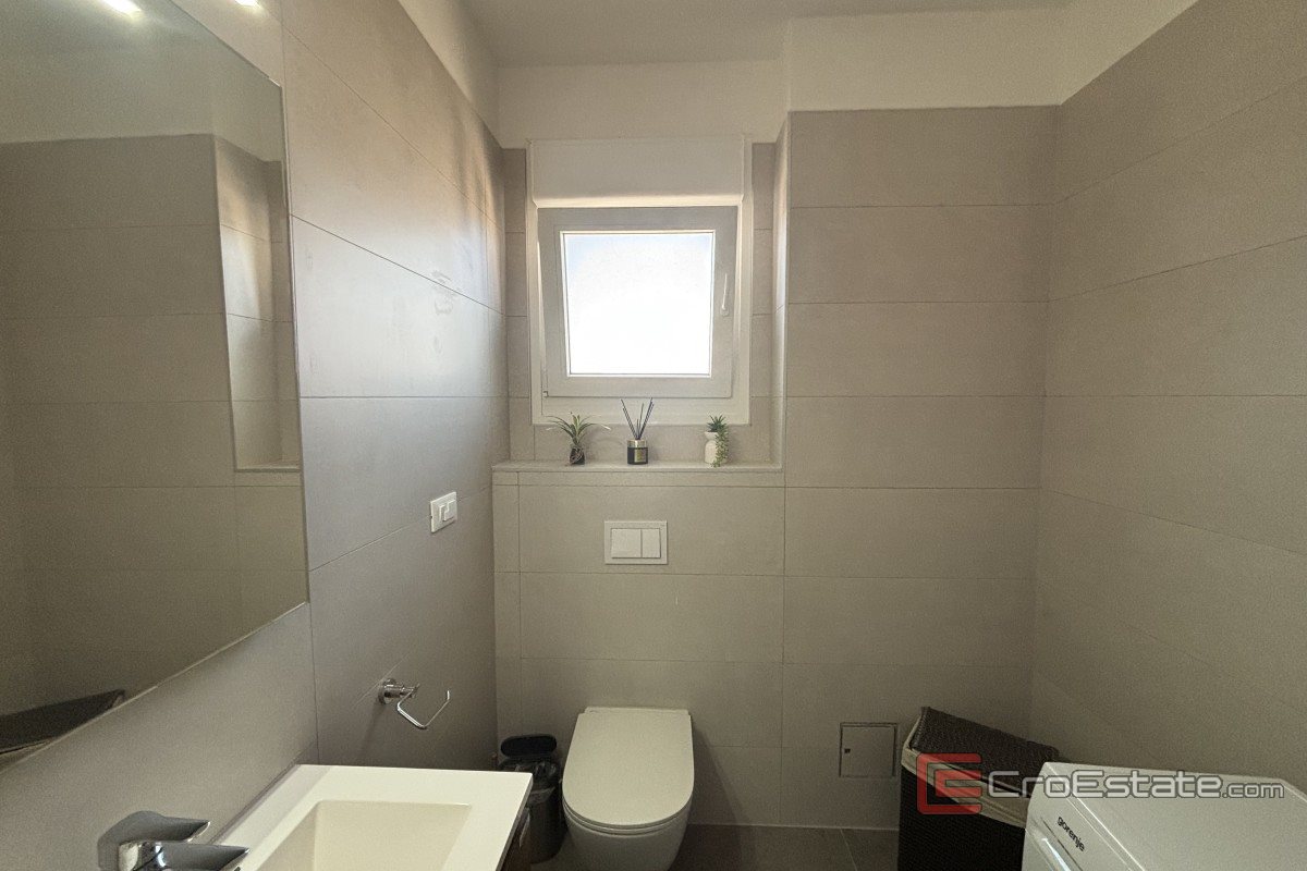 It has 105.84 m² and consists of two hallways, three bedrooms, two of which have access to a 11.26 m² balcony, two bathrooms, a toilet, a utility room, a kitchen, a dining room and a living room from which there is access to a 16.51 m² balcony with an open sea view. The biggest advantage of the apartment is the roof terrace with a pergola of about 106 m², on which various amenities can be placed depending on the buyer's wishes.