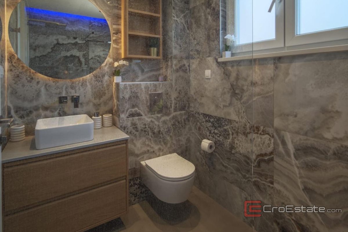 For sale is a newly built two-room penthouse apartment with a roof terrace in Trogir, on the southern side of the island of Čiovo. It is located only a 10-minute walk from the center of the town and all facilities on the island that make this location an attractive place for living and vacationing. The apartment has a southeast orientation and is located on the second and last floor of a modern residential building with a total of 4 floors, and it is decorated with a spacious roof terrace with a massage tub and a view of the sea.
