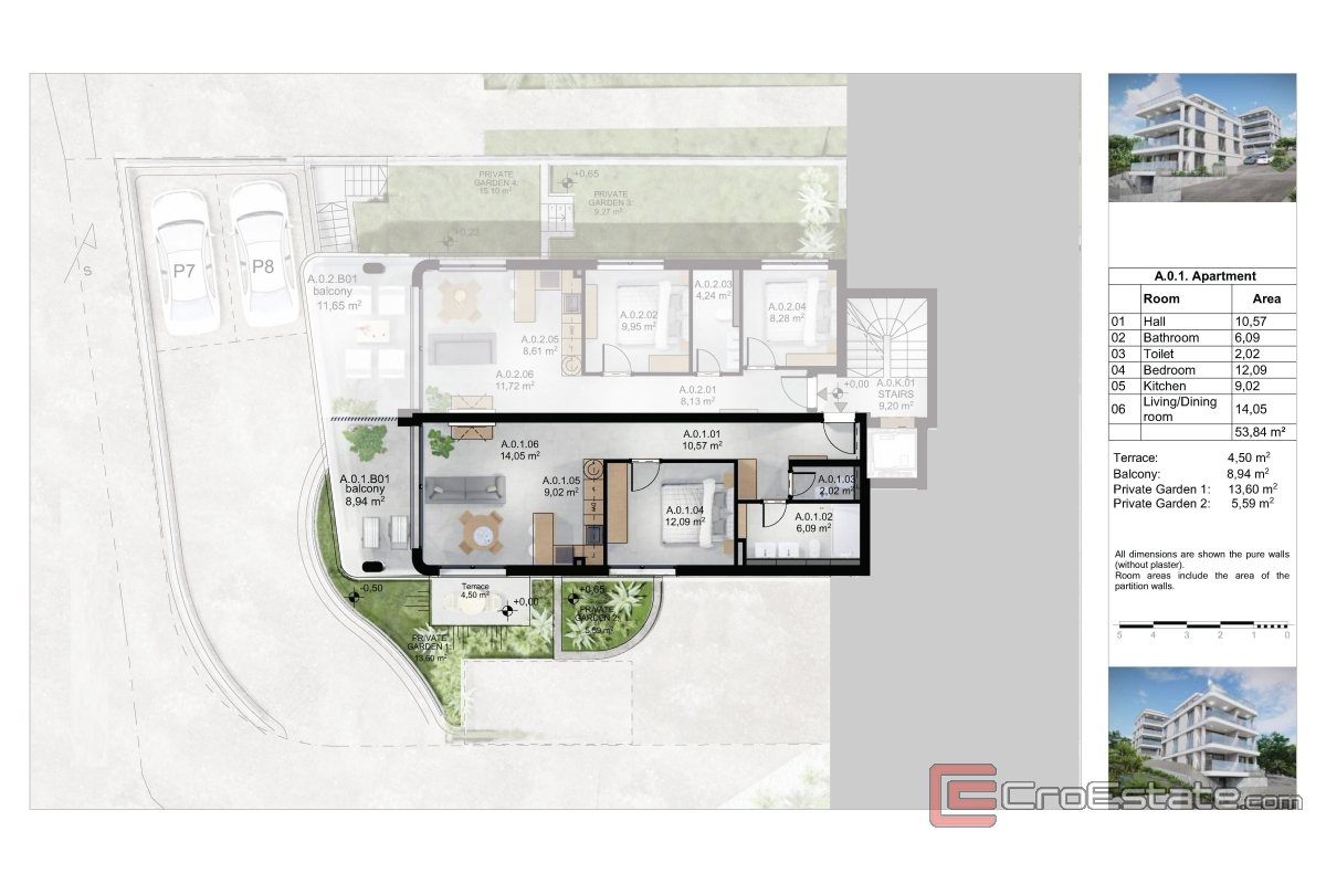 The apartment with a total living area of 53.84 m² is designed to provide maximum space utilization and comfort. It consists of an entrance area, bathroom, additional toilet, bedroom and an open living area that combines the kitchen, dining room and living room.