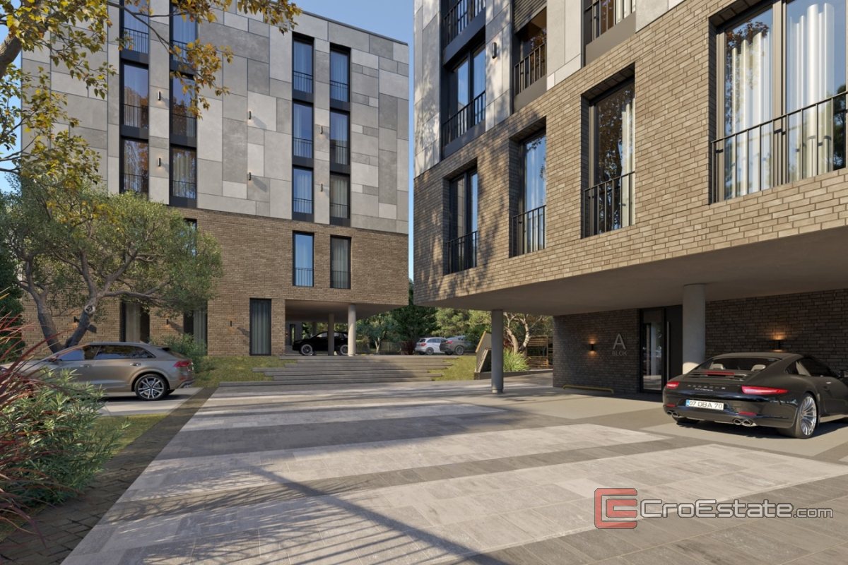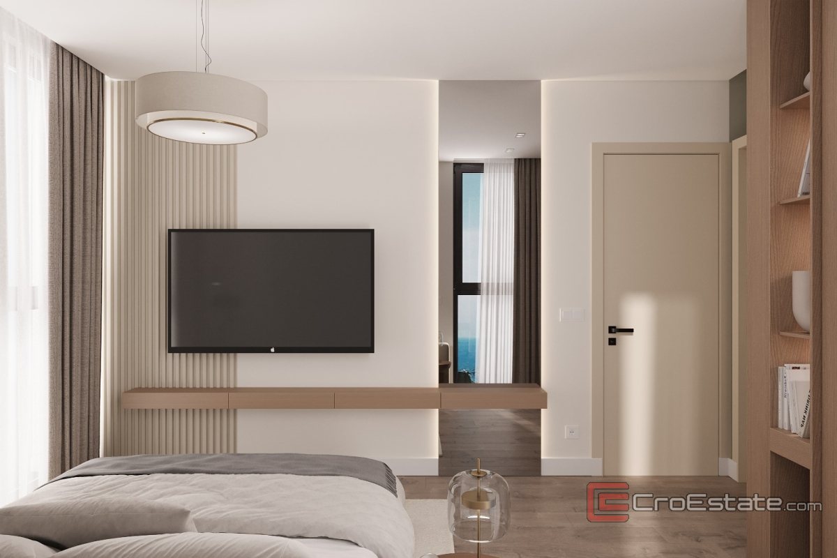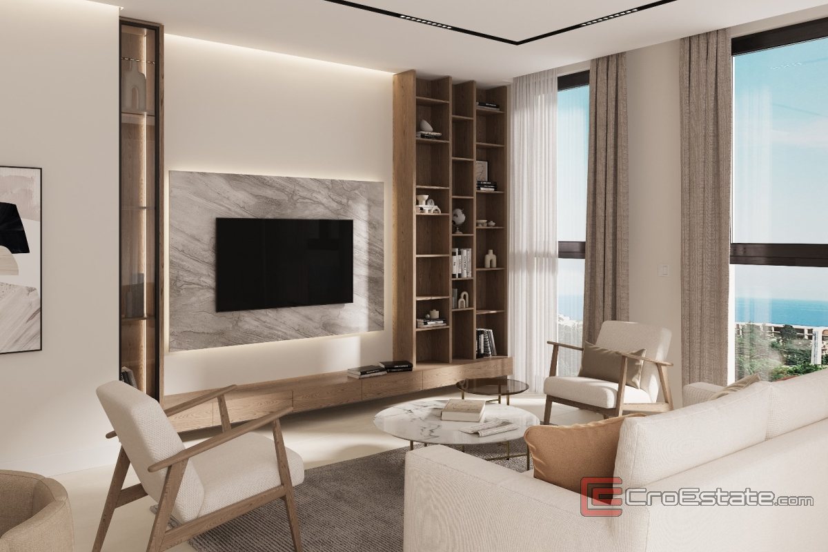 With a total area of 75 m², it consists of a hallway, laundry room, separate toilet, bathroom, two bedrooms and an open kitchen, dining room and living room with access to a spacious 15 m² loggia and a beautiful sea view. It is equipped with air conditioning for heating and cooling, with the possibility of installing underfloor heating. It is sold unfurnished, and the price includes an outdoor parking space and use of a shared garden.