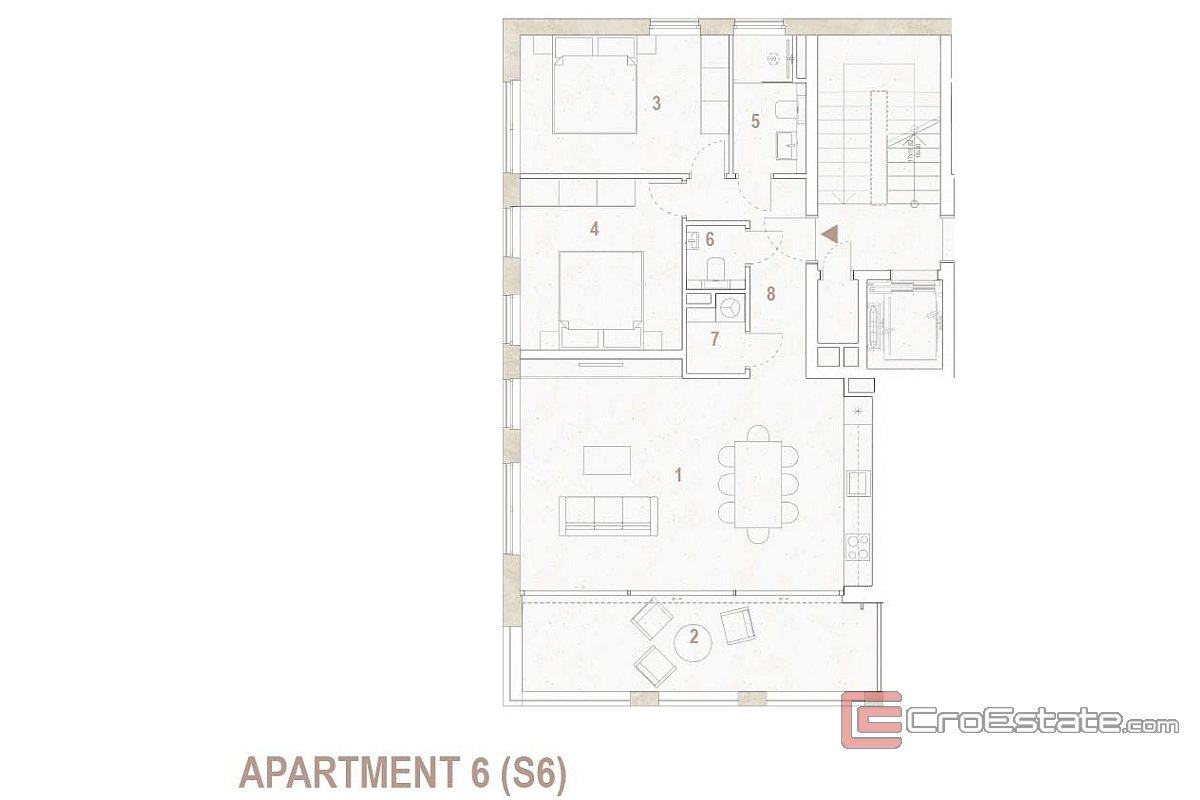 In a quiet place near Trogir, a modern two-bedroom apartment with open sea view is for sale. It is located on the third floor of a new building with an elevator, located in a neatly decorated residential complex. The apartment is southwest-oriented and has plenty of natural light.