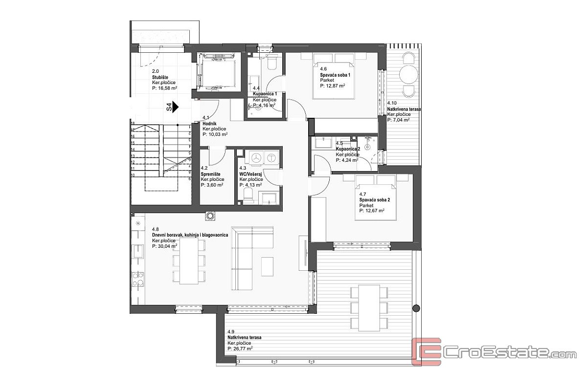 It consists of an entrance hall, two bedrooms with private bathrooms and exits to a covered terrace with a sea view. The living room with kitchen and dining room also has an exit to the terrace, which gives the space additional airiness and plenty of natural light.