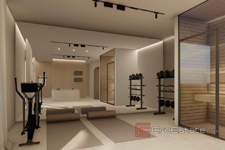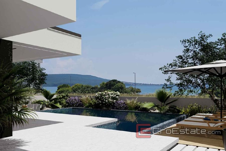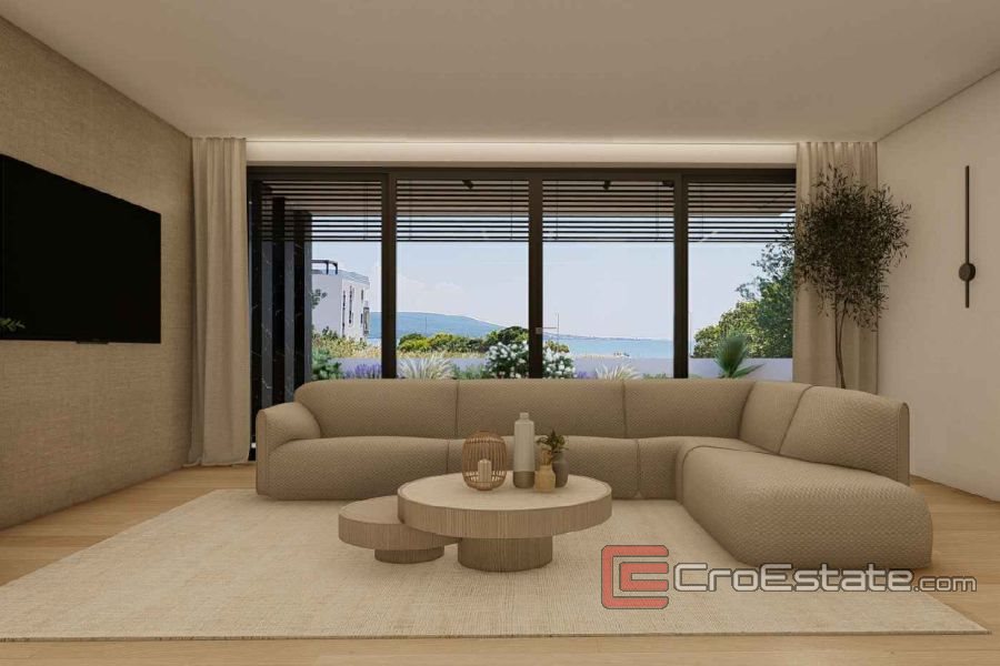 Modern detached villa for sale in the vicinity of Zadar, only 100 m from the sea. It consists of three floors and a swimming pool. The total living area of the villa is 352 m², and the land area is 497 m².