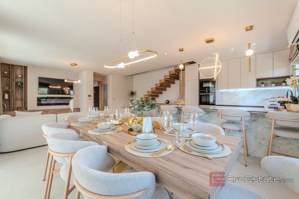 The interior of the villa consists of four spacious bedrooms with en-suite bathrooms, additional guest toilets and a spacious open-concept living room that elegantly connects to the kitchen and dining room. Large glass walls create a feeling of spaciousness and provide direct access to the terraces and outdoor space.