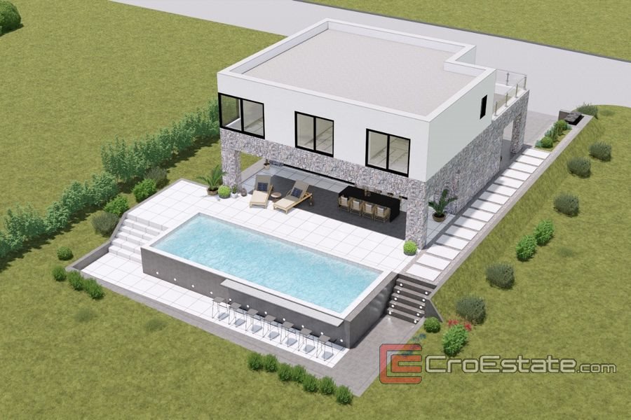 A modern villa with a ground floor and a first floor, on the ground floor there is a living room, a kitchen and a dining room with access to a covered terrace where there is a swimming pool.