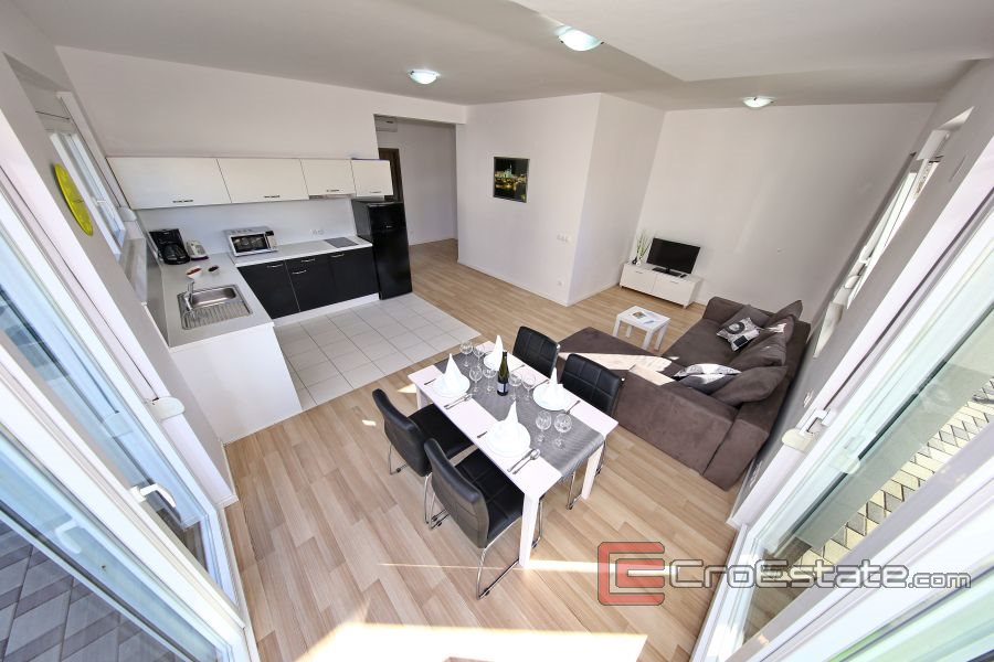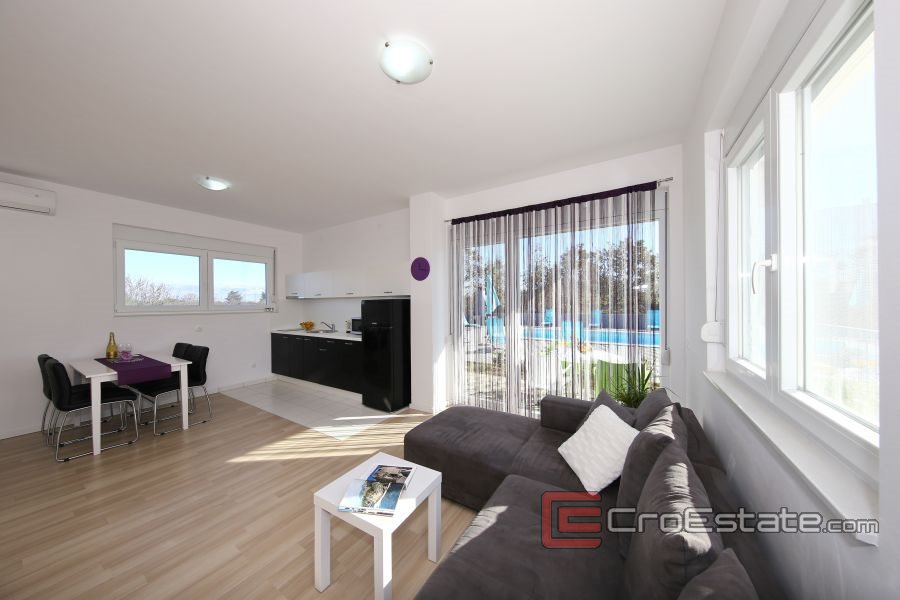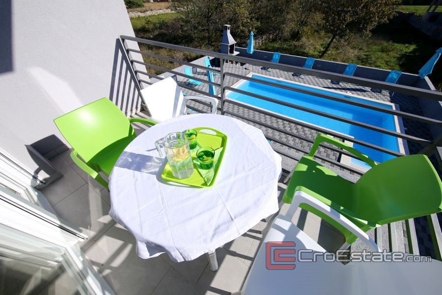 The house has outdoor parking and a beautiful swimming pool surrounded by a well-kept garden. The house itself covers an area of 240 m2 and consists of four fully equipped, modern apartments with separate entrances, each on two floors.