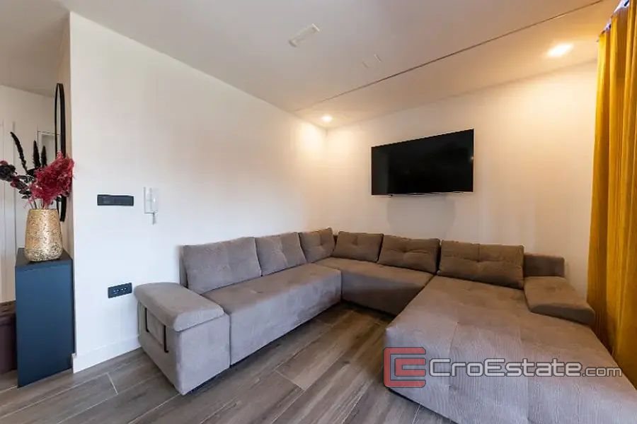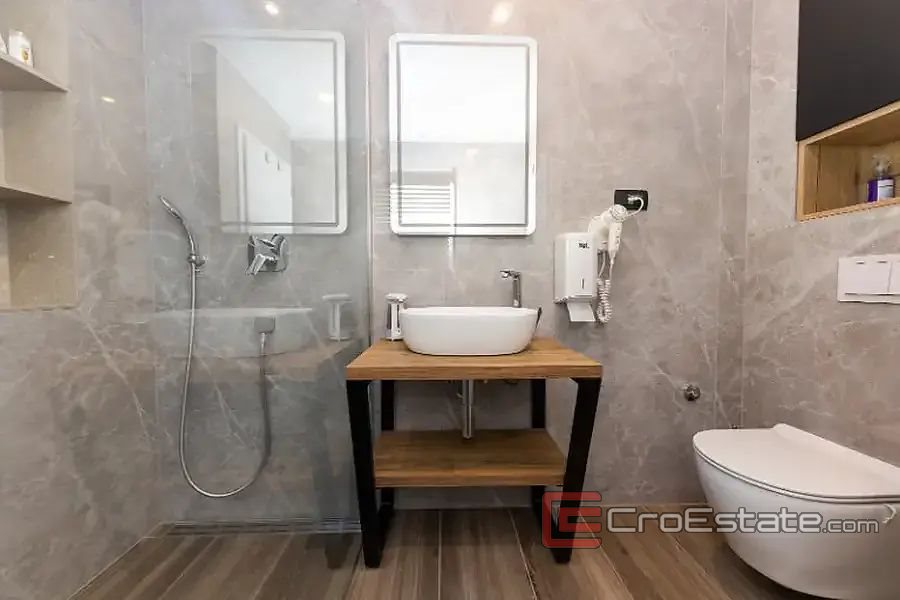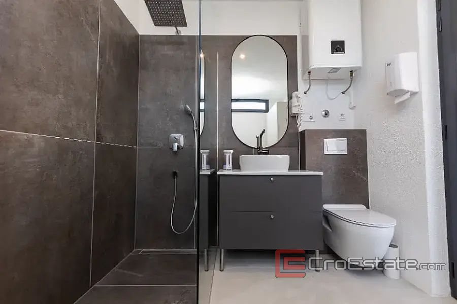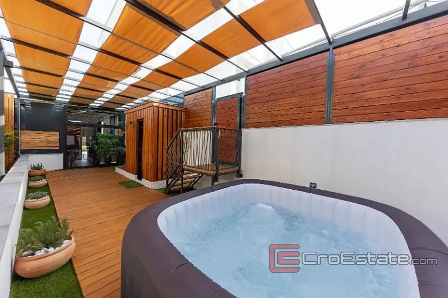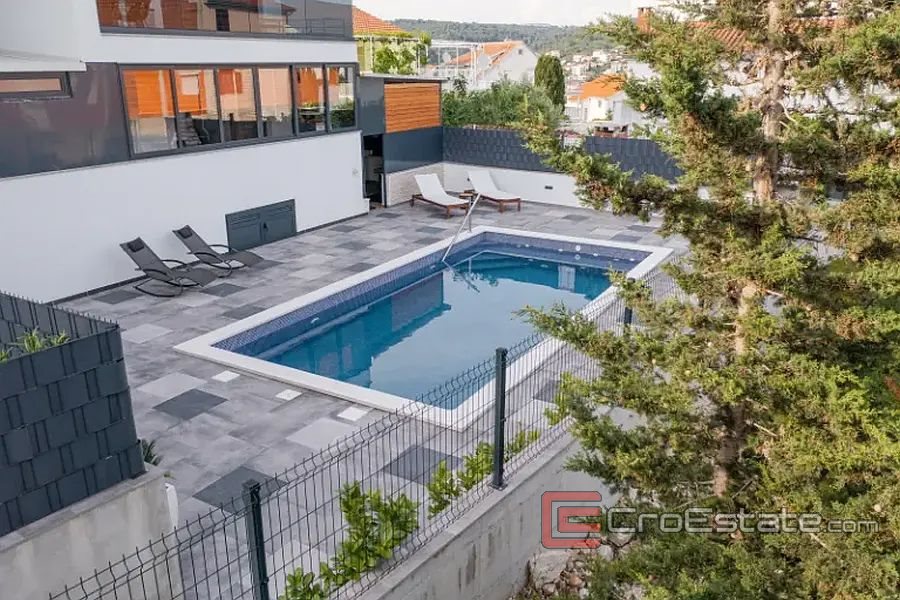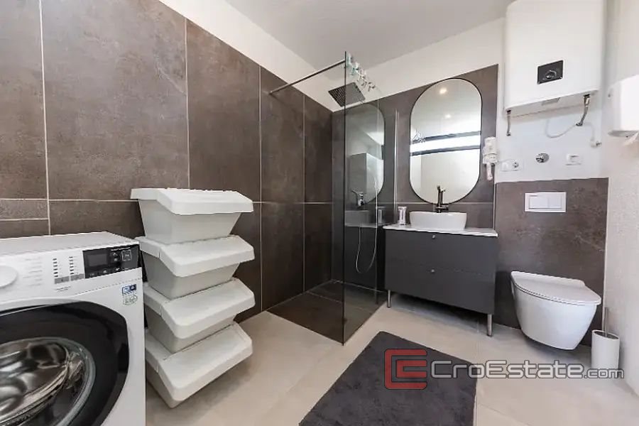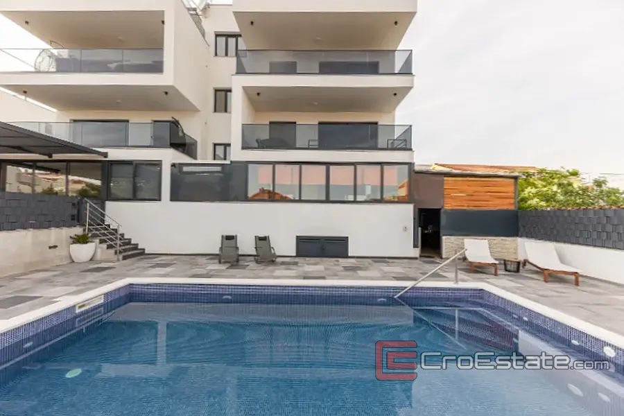 Dans un immeuble neuf, un appartement moderne à 150 m de la mer sur la côte sud de l'île de Ciovo. Situé au rez-de-chaussée d'un immeuble neuf plus petit, l'appartement a une superficie de 195 m2 et se compose d'un couloir, de deux salles de bains, de deux chambres et d'une cuisine avec salle à manger et salon, d'où on accède. à un espace joliment décoré avec accès à la cuisine d'été, salle à manger, espace barbecue et jacuzzi. L'appartement a un accès direct à la piscine commune. L'appartement dispose d'une place de parking pour deux voitures. L'appartement est vendu entièrement meublé. L'appartement est idéal pour une location touristique car il est proche de toutes les commodités et à seulement 15 kilomètres de l'aéroport.