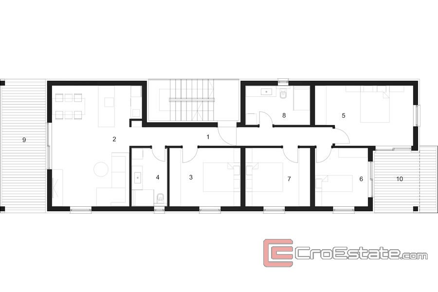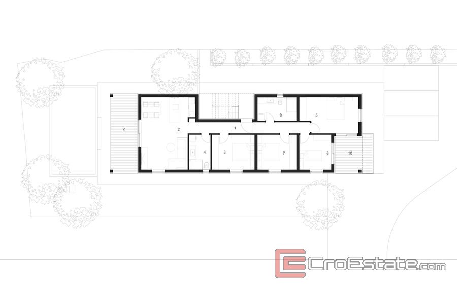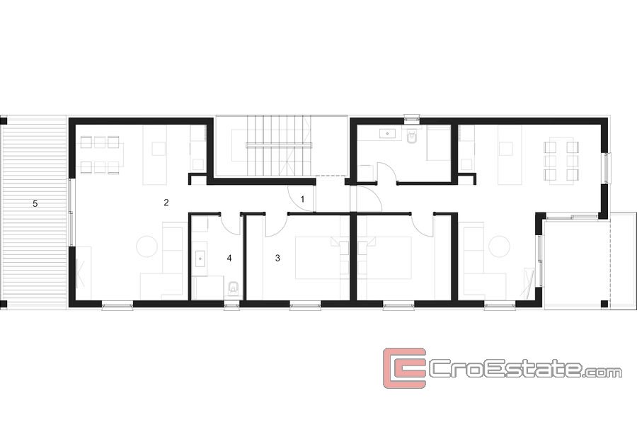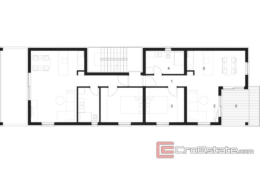 Le bâtiment aura un total de trois étages. Au rez-de-chaussée, il y aura un spacieux appartement de quatre chambres avec deux salles de bains et un salon confortable avec accès à la terrasse. L'appartement aura également une terrasse sur le côté est du bâtiment et un jardin avec piscine et solarium. Au premier et au deuxième étage, il y a des appartements identiques avec balcons, tandis que l'appartement penthouse aura également une terrasse sur le toit que l'acheteur pourra aménager à sa guise. L'investisseur offre également la possibilité de diviser les appartements du premier et du deuxième étage en deux appartements d'une chambre en miroir, auquel cas les appartements partageront les balcons et la terrasse sur le toit.