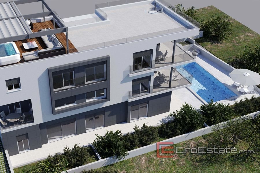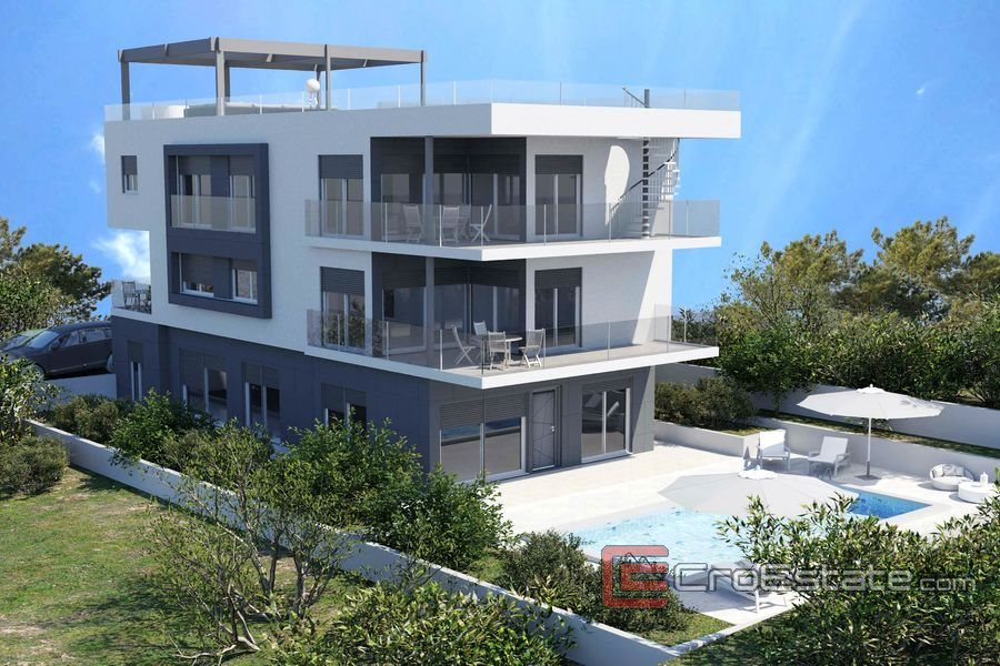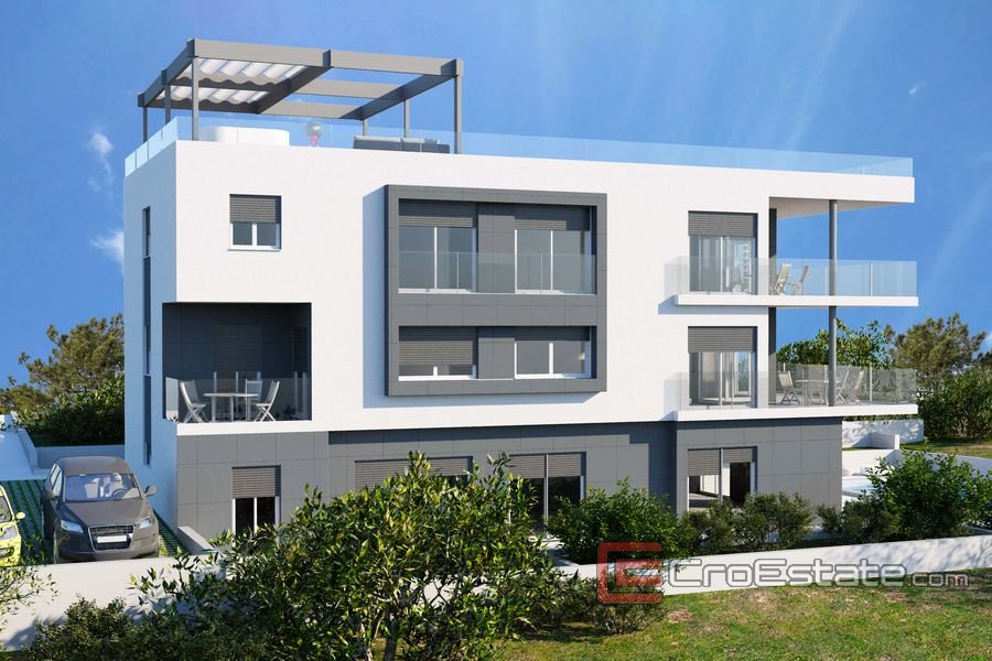 Appartements en construction avec vue sur la mer sur le côté ouest de l'île de Ciovo. Ce bâtiment moderne de 5 appartements est situé à proximité immédiate de la mer, à seulement 150 mètres de la belle plage. L'installation sera orientée vers l'ouest et sera entourée de nouveaux bâtiments.