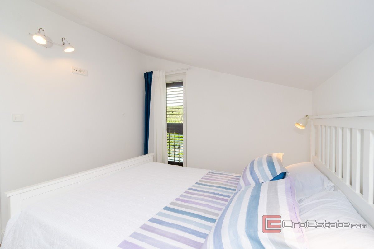 Cette maison de vacances est disponible à la vente, située dans une baie calme et charmante, à seulement 80 mètres de la mer et de la plage, avec une vue imprenable sur la mer et les îles Élaphites. Elle se trouve sur un terrain de 350 m², pour une surface habitable de 75 m² répartie sur deux niveaux.