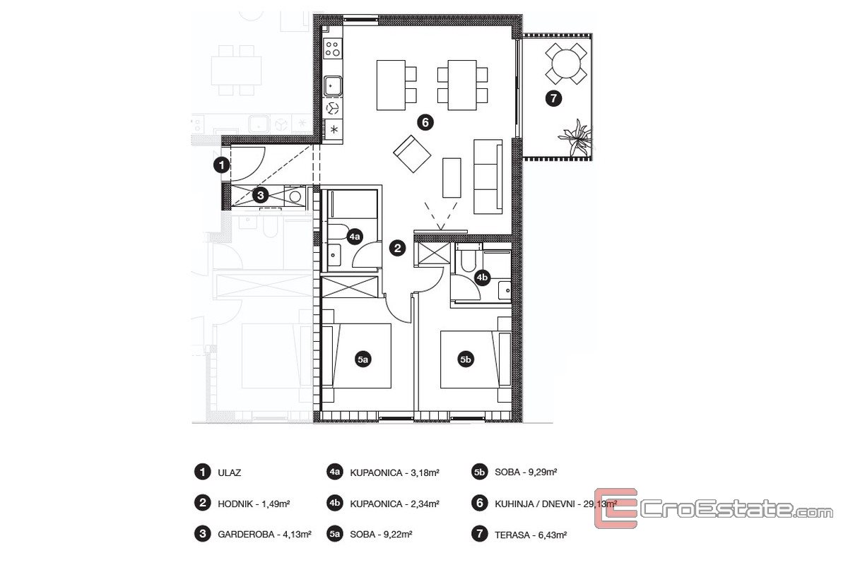 Au premier étage du bâtiment A se trouve l'appartement S3. Il comprend une entrée avec dressing, un spacieux séjour ouvert sur la cuisine et la salle à manger, ainsi qu'une sortie sur la loggia. Au rez-de-chaussée se trouvent une salle de bains et un couloir desservant deux chambres, dont une avec sa propre salle de bains.