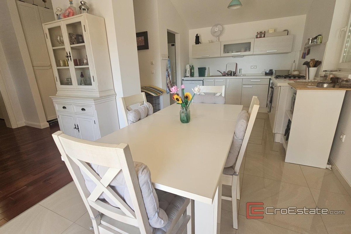 Un confortable penthouse est à vendre à Malinska, à quelques minutes à pied de la mer et du centre-ville. Situé au deuxième étage d'un immeuble récent, cet appartement allie confort, fonctionnalité et emplacement pratique. L'appartement spacieux comprend trois chambres, une salle de bains et des toilettes supplémentaires, une cuisine avec cellier, une salle à manger et un salon lumineux donnant sur un balcon couvert offrant une vue partielle sur la mer. L'une des chambres possède également son propre balcon, garantissant une intimité accrue et la jouissance de l'espace extérieur. Une attention particulière a été portée à la qualité de la construction et des équipements : climatiseurs multi-split, chauffage au sol, menuiseries en PVC et portes blindées ne sont que quelques-uns des atouts de l'appartement. L'appartement dispose d'un débarras au sous-sol et d'une place de parking sécurisée. L'appartement est vendu entièrement meublé et prêt à être habité immédiatement. Grâce à sa situation calme à proximité des plages et de toutes commodités, cette propriété est parfaite aussi bien pour y vivre que pour des fins touristiques.