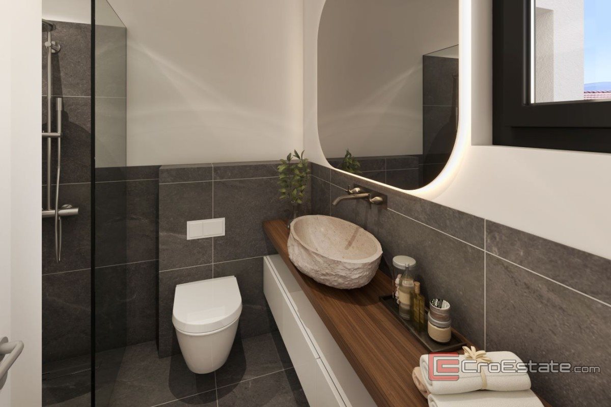 À vendre, cet appartement moderne et spacieux, situé au rez-de-chaussée d'un immeuble neuf à Orebić, offre une superficie totale de 99 m². Il comprend deux chambres, deux salles de bains élégamment décorées, deux loggias et une spacieuse terrasse ouverte. Il dispose également d'un jardin privé de 100 m² avec jacuzzi.