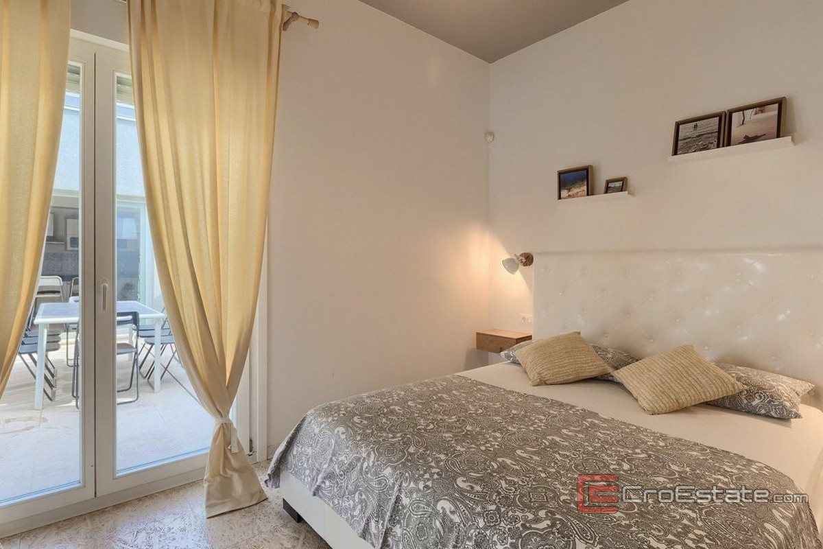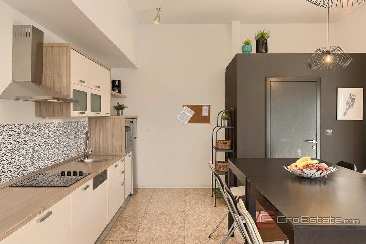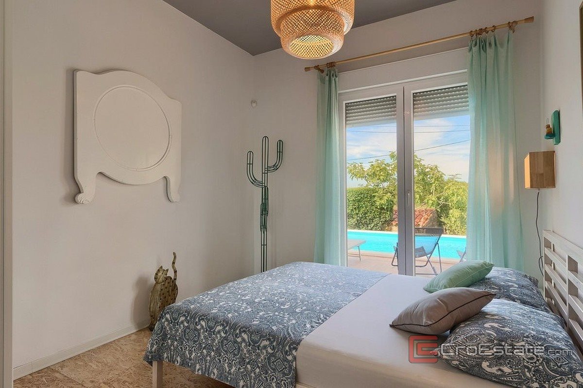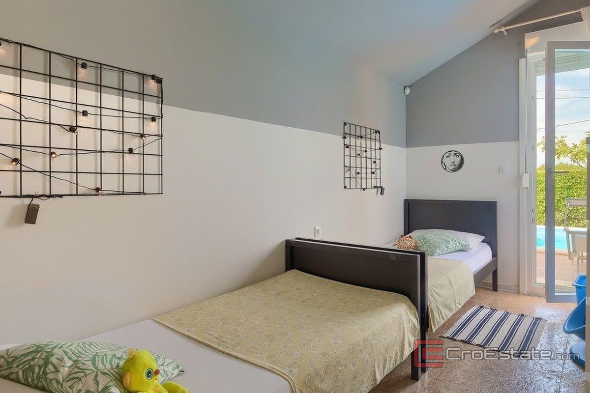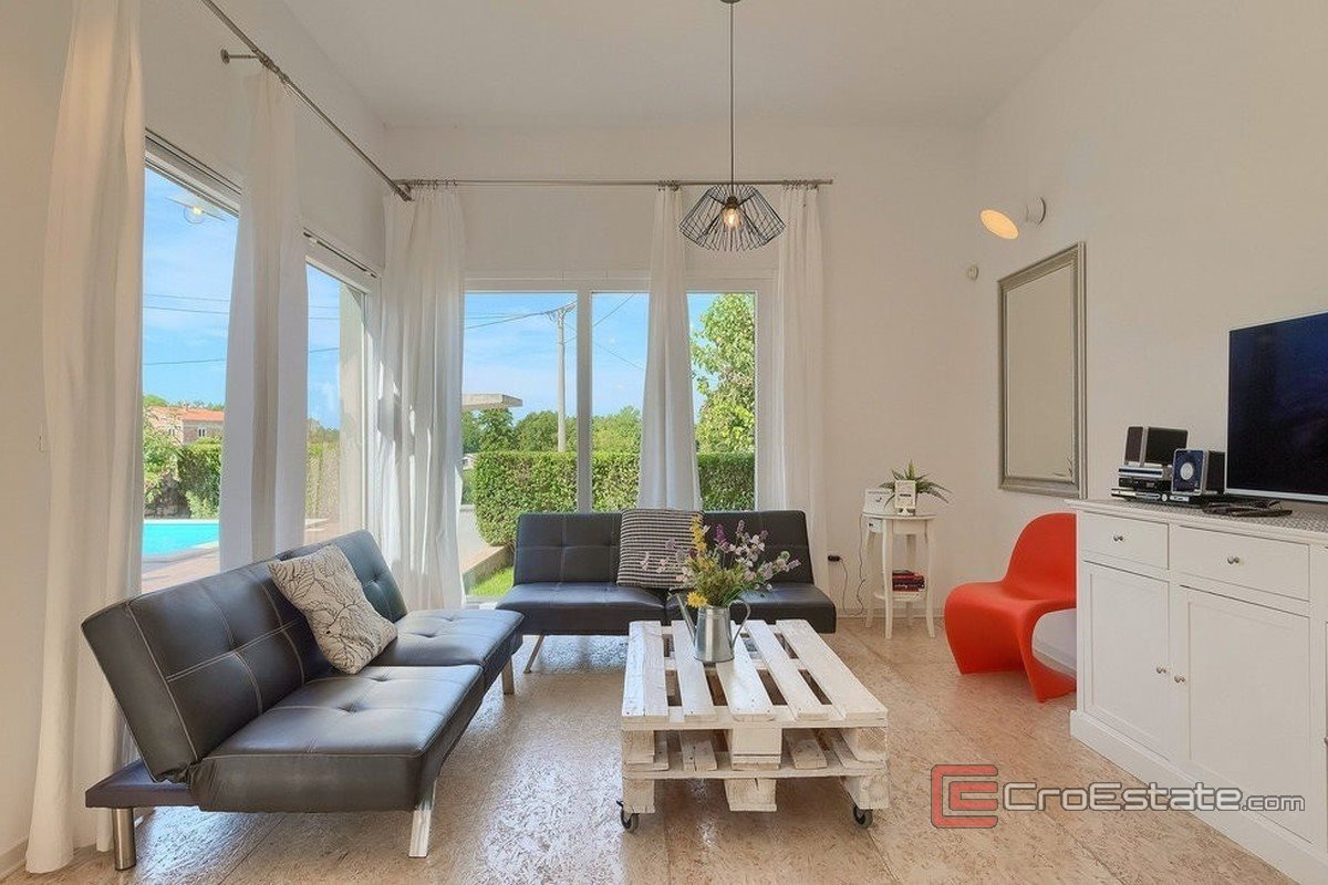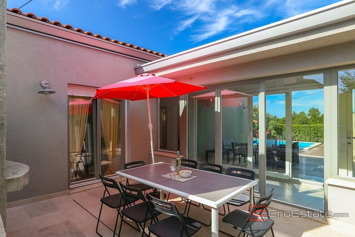 À vendre, cette maison de plain-pied de 120 m² est située sur un terrain paysager de 324 m², à quelques minutes en voiture de Poreč et de la mer. Entièrement meublée et habitable de suite, elle offre un aménagement fonctionnel et comprend un spacieux séjour avec salle à manger et cuisine, trois chambres, deux salles de bains et des toilettes invités. Dans la cour, une piscine avec solarium, protégée par la verdure, offre intimité et tranquillité. L'atrium, avec cheminée et grande table, est idéal pour les réunions tout au long de l'année. La maison est préfabriquée et équipée de climatiseurs Inverter pour un séjour confortable en toute saison.