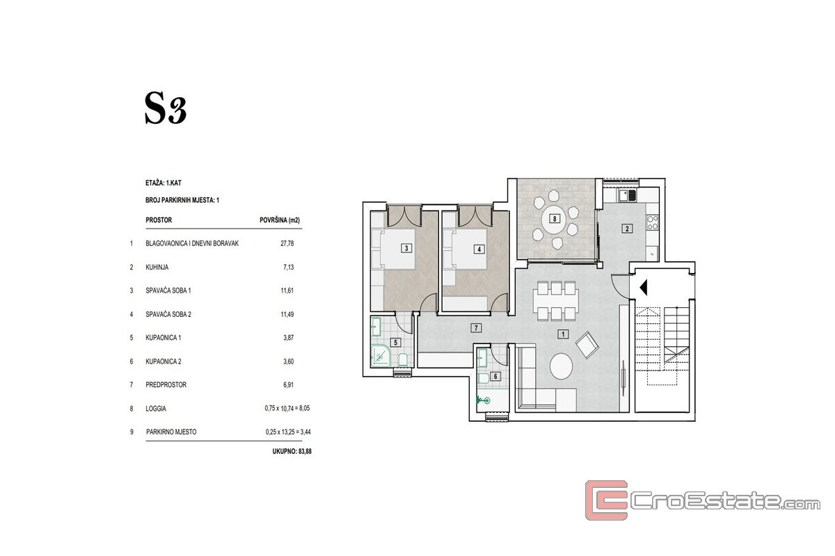 - Appartement S3, 1er étage - 84m2 - Composé d'un séjour avec salle à manger, cuisine, 2 chambres, 2 salles de bains, couloir, loggia et place de parking.