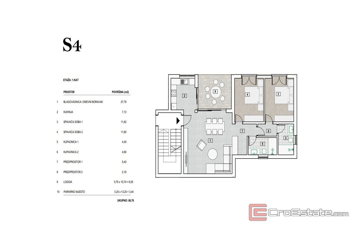 - Appartement S4, 1er étage - 87 m2 - Composé d'un séjour avec salle à manger, cuisine, 2 chambres, 2 salles de bains, couloir, loggia et place de parking.