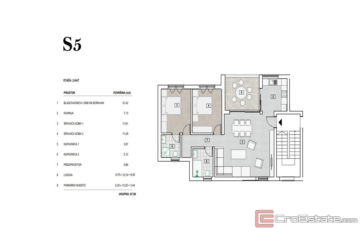 - Appartement S5, 2e étage - 88 m2 - Composé d'un séjour avec salle à manger, cuisine, 2 chambres, 2 salles de bains, couloir, loggia et place de parking.