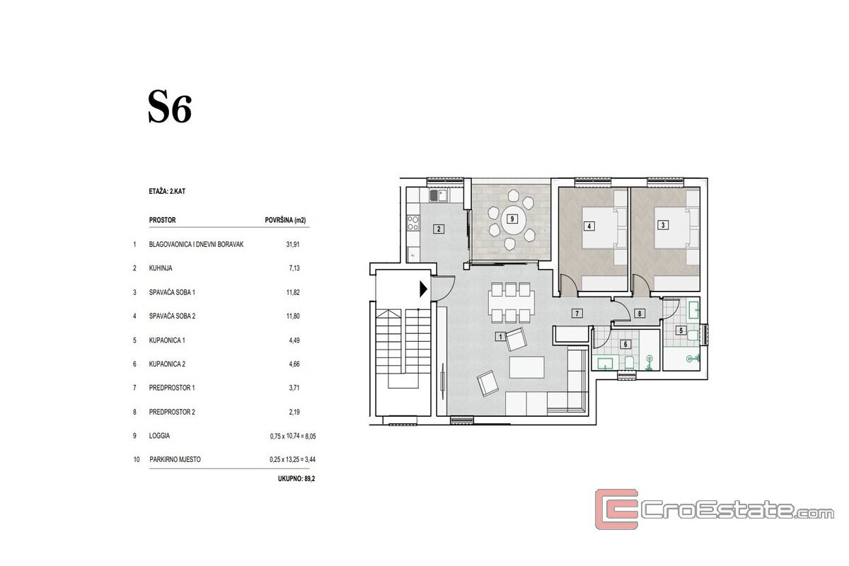 - Appartement S6. 2e étage - 89 m2 - Composé d'un séjour avec salle à manger, cuisine, 2 chambres, 2 salles de bains, couloir, loggia et place de parking.