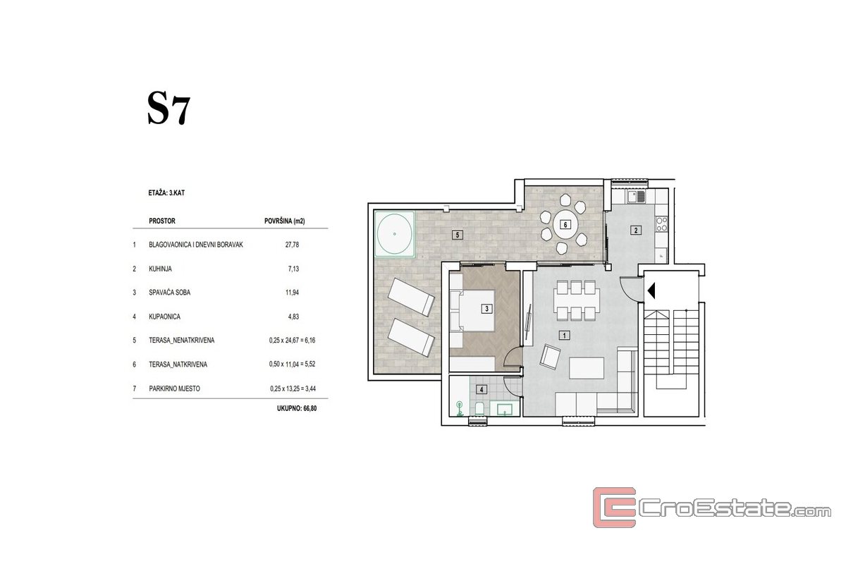 - Appartement S7. Penthouse - 67m2 - Il se compose d'un séjour avec salle à manger, cuisine, chambre, salle de bain, 2 terrasses et une place de parking.