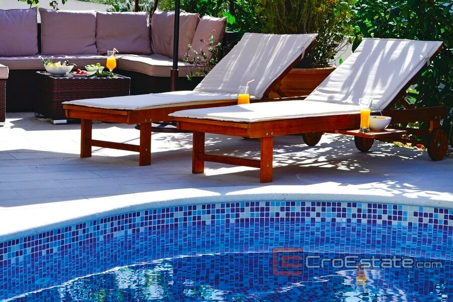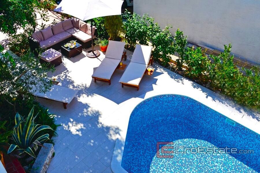 La cour est paysagée, cultivée avec des plantes méditerranéennes densément plantées, et en plus de la piscine chauffée, il y a un solarium, un barbecue et un parking pour au moins trois voitures.