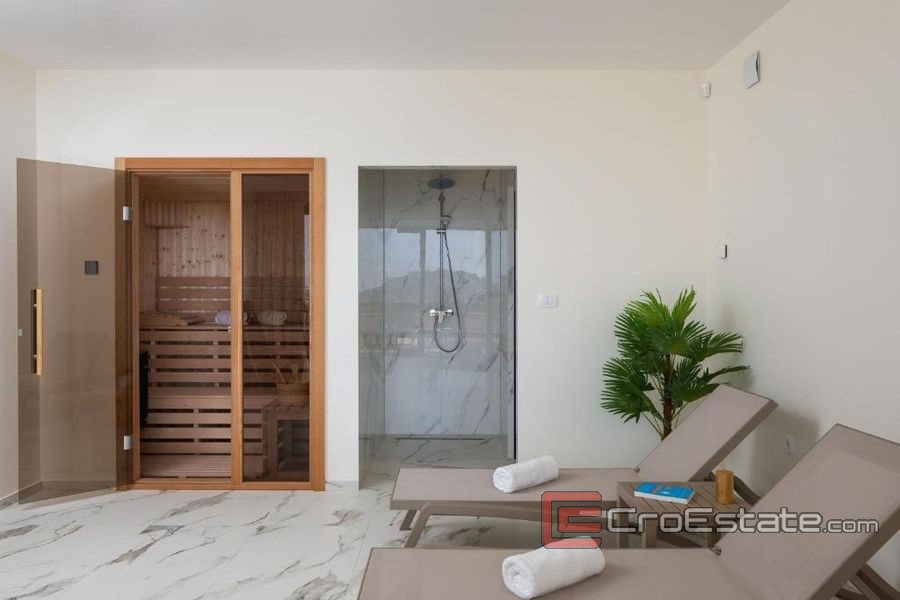 Le rez-de-chaussée dispose d'un espace bien-être avec sauna et jacuzzi, salle de bain, WC avec buanderie, local technique, cuisine à aire ouverte, salle à manger et salon avec accès à une terrasse spacieuse de 110m2 où il se trouve