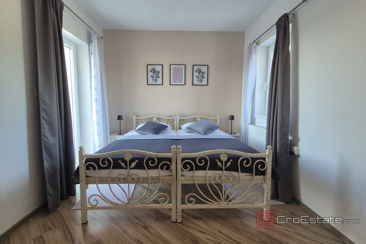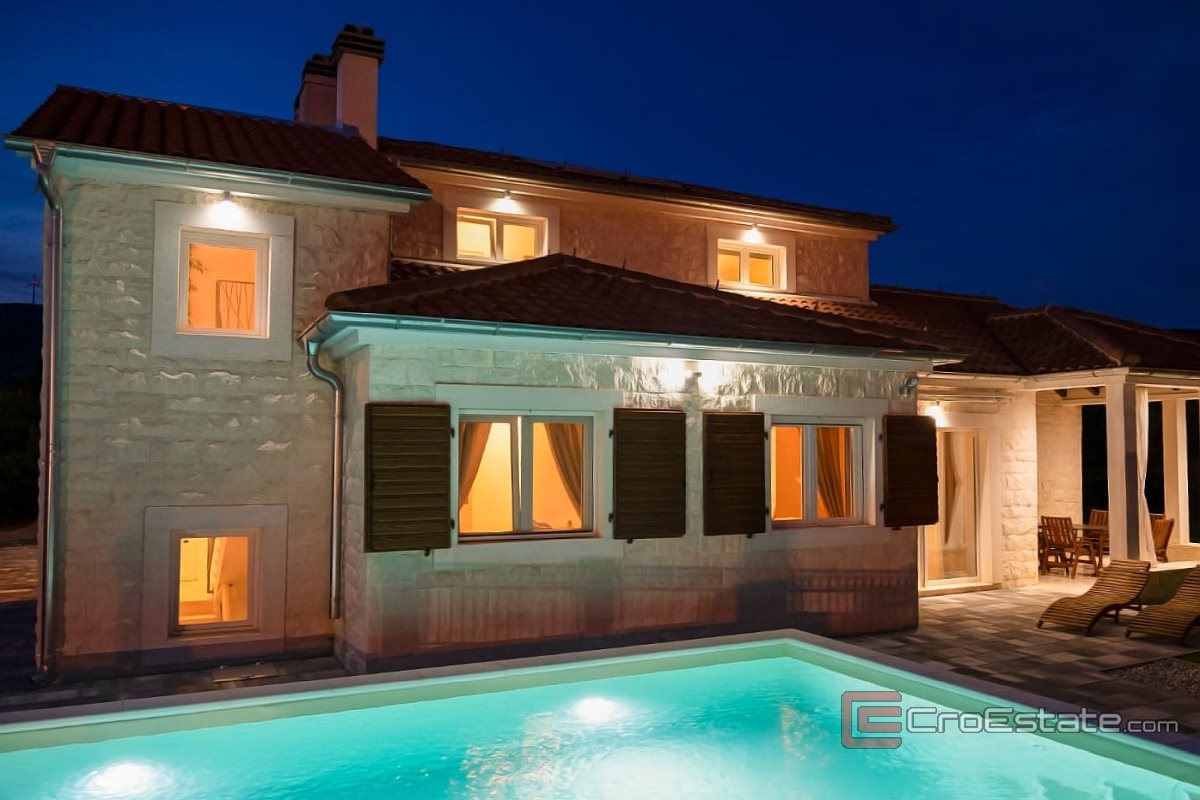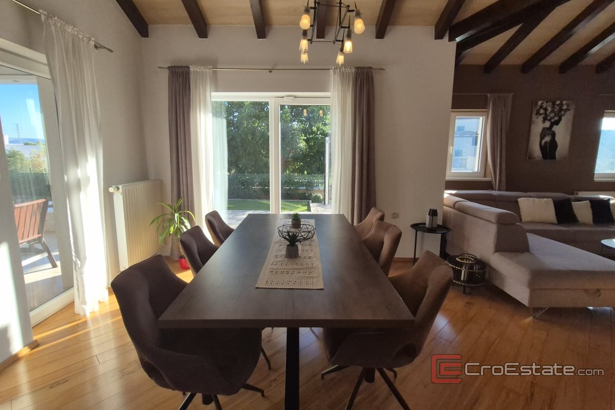 Une villa moderne est à vendre, située près de Šibenik, adaptée à la vie de famille ou comme investissement touristique. Cette propriété s'étend sur trois étages. Le premier étage comprend un sous-sol et une chaufferie. Le deuxième étage comprend deux terrasses semi-couvertes, une salle de loisirs avec billard, fléchettes et cheminée, un salon, une salle à manger, une cuisine, un cellier, une terrasse, une salle de bain, des toilettes et une chambre. Le troisième étage comprend deux chambres, une salle de bain, une buanderie, un couloir et une terrasse. L'extérieur de la villa offre une piscine, une cheminée extérieure, un garage et plusieurs places de parking. La grande cour a une zone rectangulaire qui peut être utilisée pour des activités sportives. La villa est équipée de panneaux solaires et d'un chauffage au sol dans la cuisine, le salon, les chambres et la salle de bain au rez-de-chaussée. Il est situé à 4,3 km de la côte et à 4,5 km du centre-ville, offrant un emplacement calme à proximité de toutes les commodités essentielles.