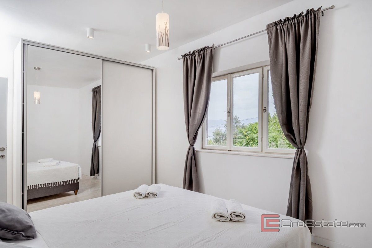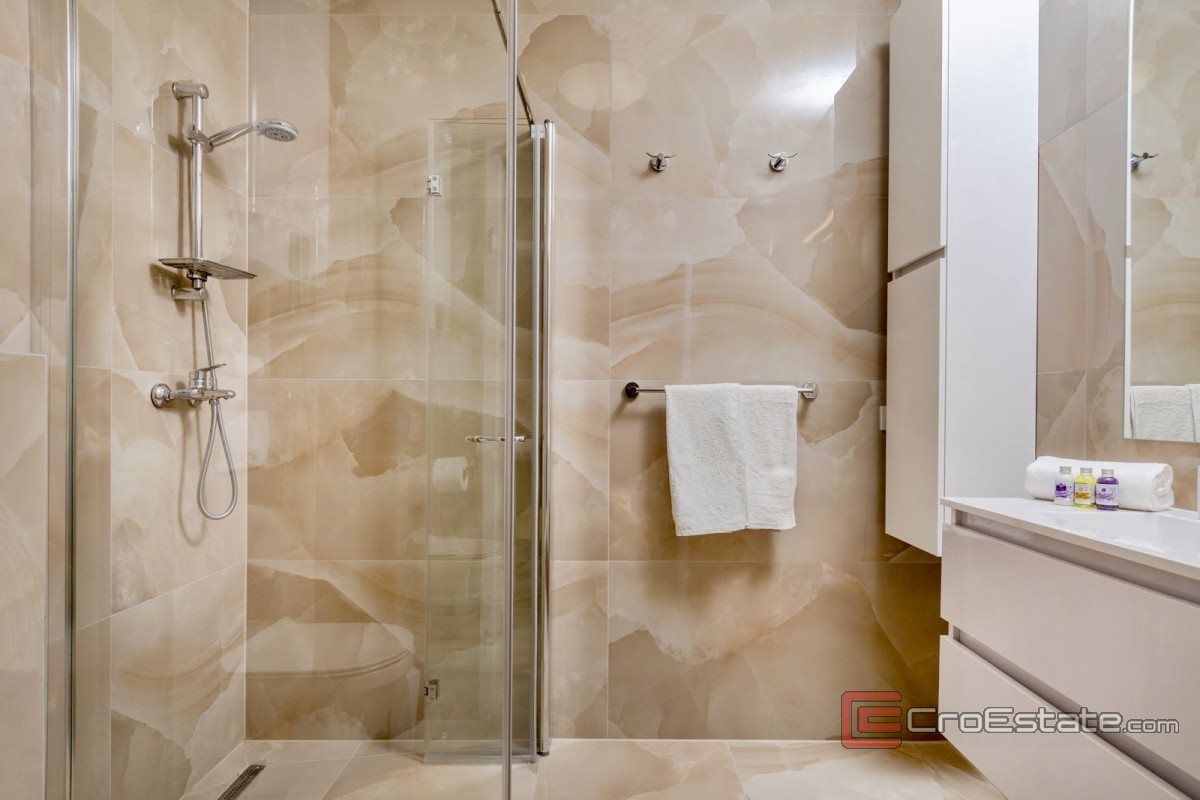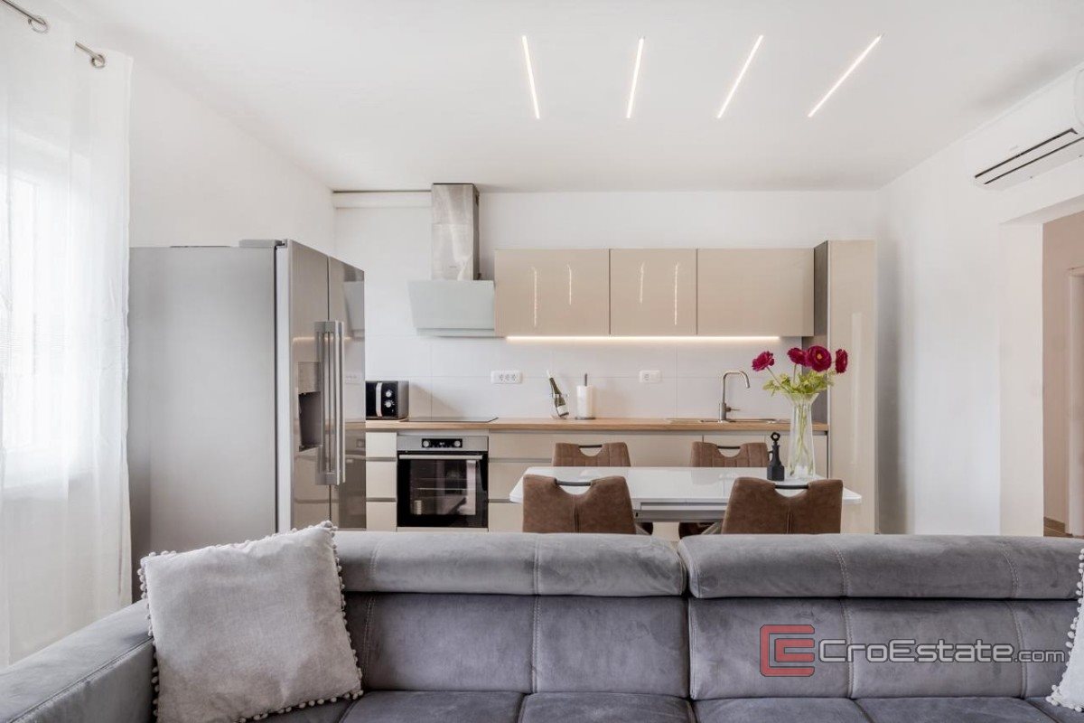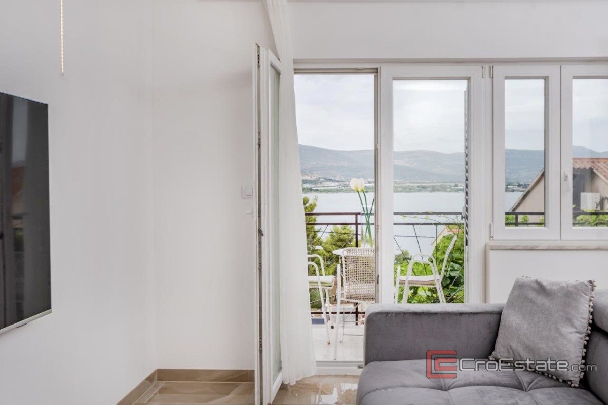 À vendre : appartement rénové et décoré avec goût, situé au rez-de-chaussée d'un immeuble dans un quartier calme de Trogir, offrant une magnifique vue dégagée sur la mer. D'une surface habitable de 101 m², l'appartement bénéficie d'un vaste jardin de 343 m², viabilisé et constructible, offrant de nombreuses possibilités d'aménagement, comme la création d'une piscine, d'une cuisine d'été ou d'autres installations selon les souhaits du futur propriétaire. L'appartement comprend trois chambres, trois salles de bains, un séjour, une cuisine ouverte sur la salle à manger et un couloir. Le séjour et l'une des chambres donnent accès à un balcon, tandis que la terrasse offre un espace supplémentaire pour se détendre et profiter du plein air. Deux chambres disposent de leur propre salle de bains, garantissant un confort et une intimité optimaux. Vendu entièrement meublé, l'appartement a été rénové en 2022. Il est équipé du chauffage au sol, de la climatisation et d'une cheminée. L'appartement dispose d'une entrée indépendante, est raccordé au réseau d'eau potable et d'assainissement de la ville, et comprend une dépendance faisant office de débarras. Deux places de parking extérieures couvertes sont également incluses. L'appartement est loué avec succès à des fins touristiques depuis de nombreuses années, affichant un taux d'occupation élevé en haute saison, ce qui permettra au futur propriétaire de poursuivre cette activité déjà rentable. Son emplacement est extrêmement pratique : la mer et la plage sont à une minute à pied, tandis que les commerces, restaurants et toutes les commodités sont à proximité immédiate. Le centre de Trogir se trouve à environ 2 kilomètres et l'aéroport de Split à seulement 8 minutes en voiture. Ce bien représente une excellente opportunité d'investissement dans le tourisme, mais aussi pour une vie agréable au bord de la mer.